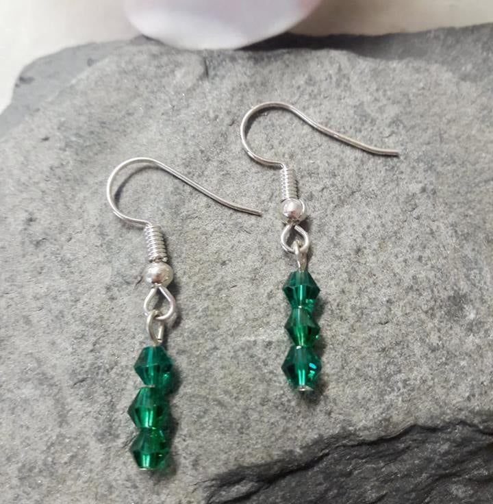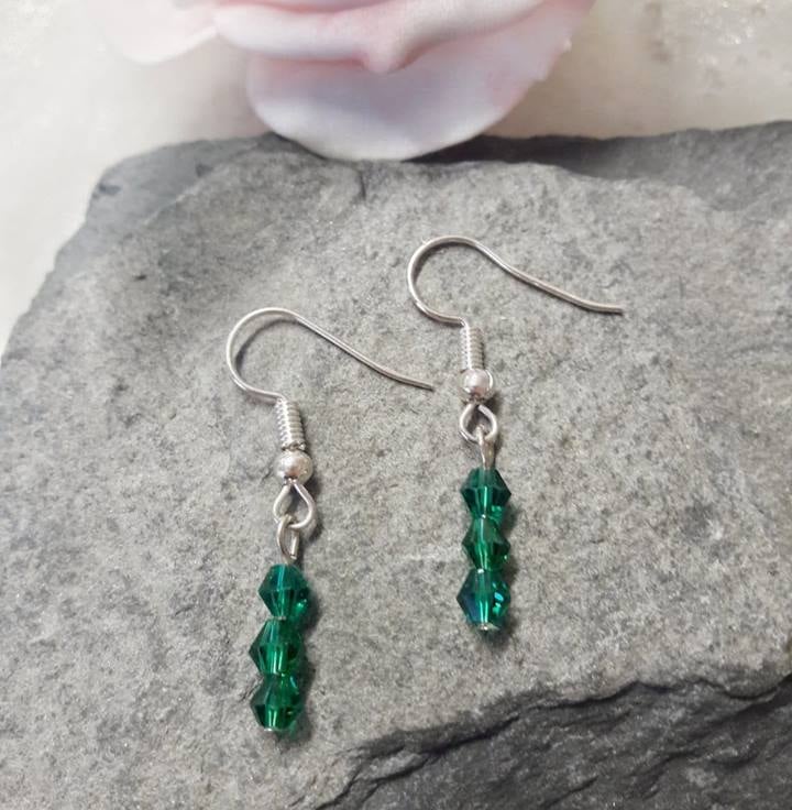 Handmade dangle earrings made with emerald coloured crystals on nickle free hooks.