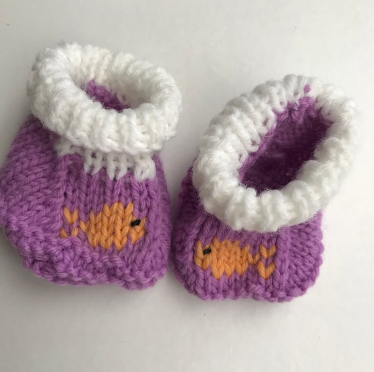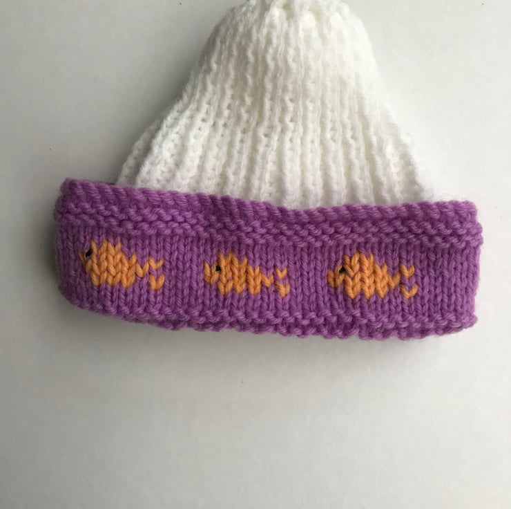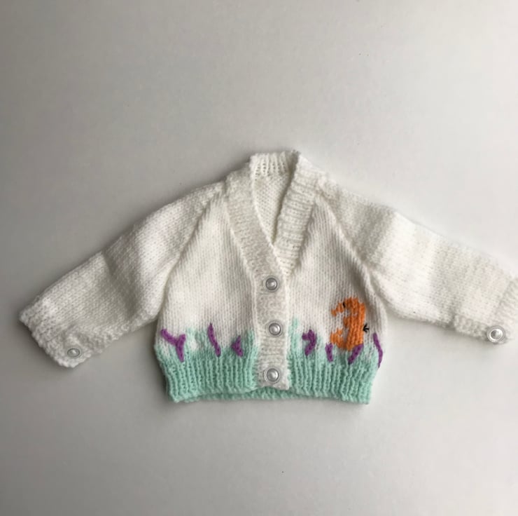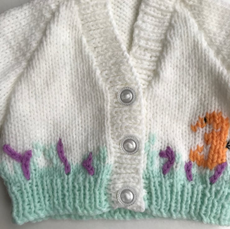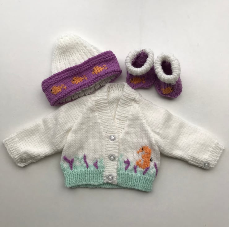 This hand knitted set for a prem baby consists of a cardigan, hat and bootees. It is worked in a soft cream baby yarn and has a sea creature theme. The cardigan has a v-neck and fastens with three buttons. It also has buttons on the cuffs making it easier to fit over tiny hands. The bottom of the cardigan is worked in aqua and has a seahorse on the front. The hat has a folded back brim in purple which has a row of fish on it. The bootees, in purple with cream cuffs, also has a fish on the front.