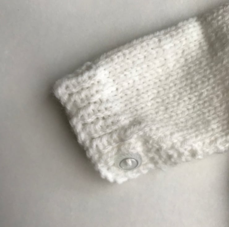 Measurements - cardigan chest 32cm, length 14cm, sleeve 10cm, hat circumference 26cm, bootee sole 6cm