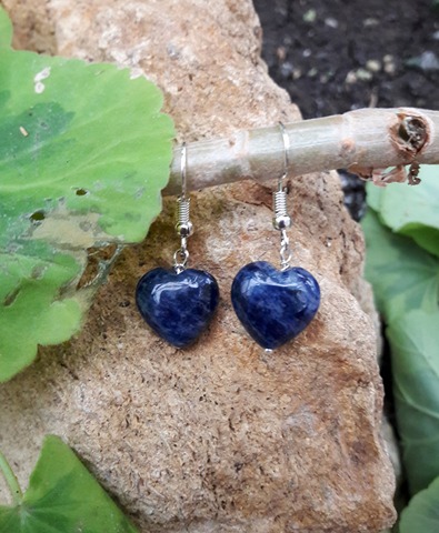 Cute Sodalite Gemstone Heart Dangle Earrings. Blue and stone coloured gem earrings made by hand and secured onto a nickel free hook.