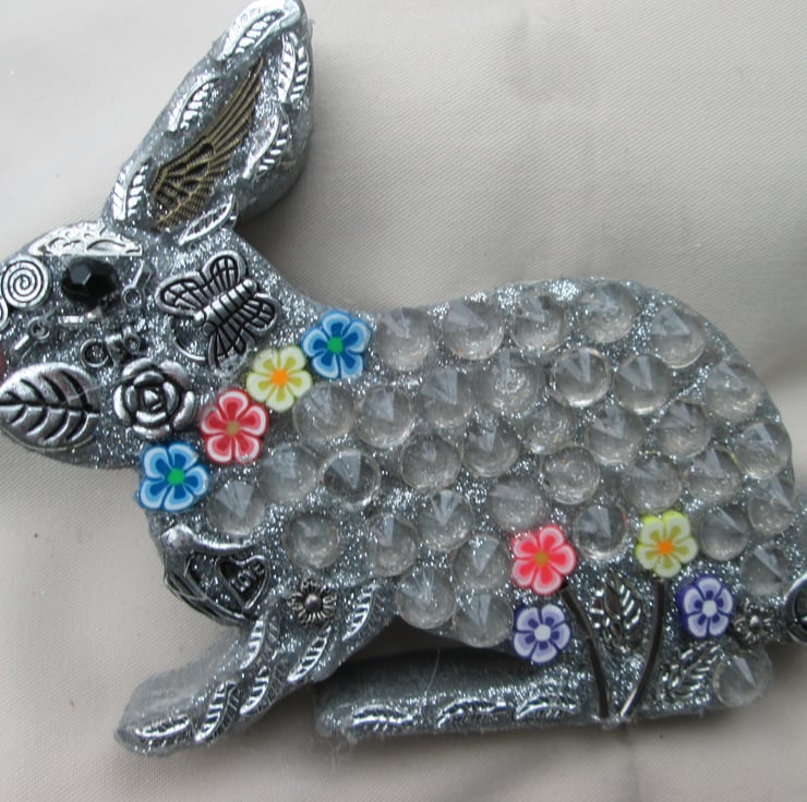 These mosaic Silver rabbits are freestanding on a wooden base decorated with flowers and charms. they are 17cm x 13cm in size .