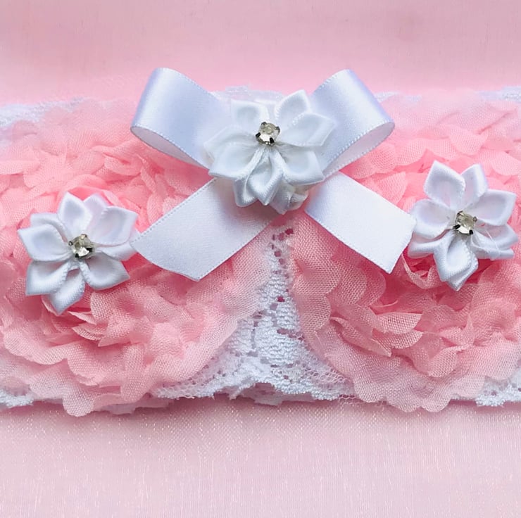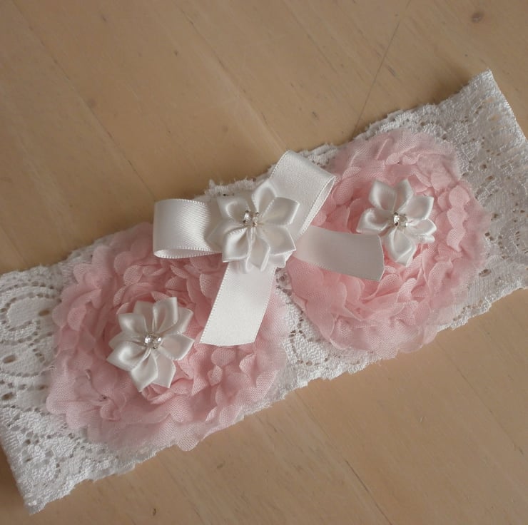 Handmade Soft white stretch lace wedding garter with pink organza flowers, white satin flowers and white satin bow embellished with rhinestones.