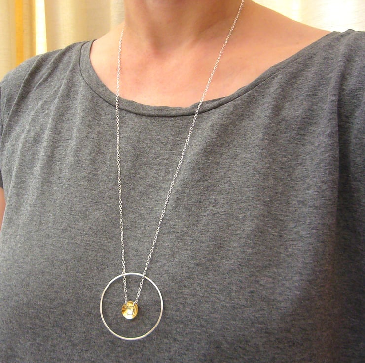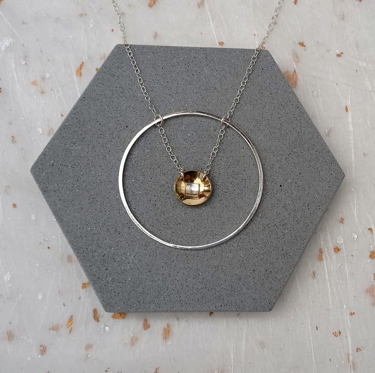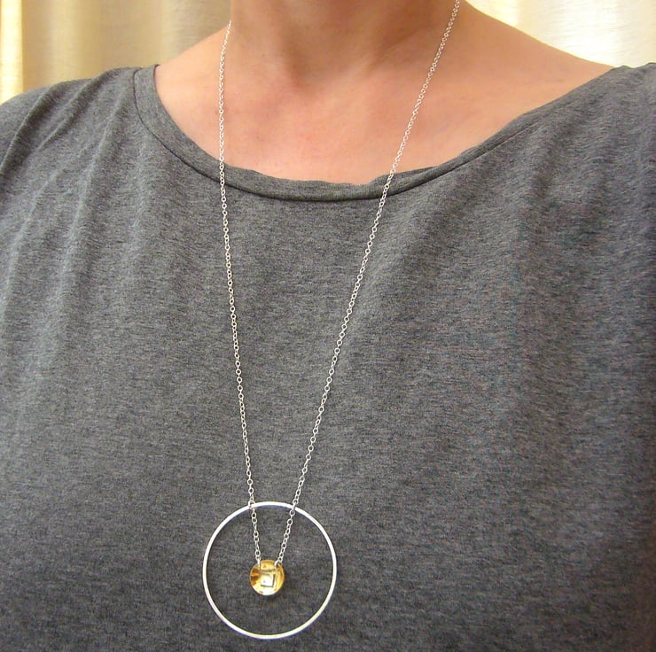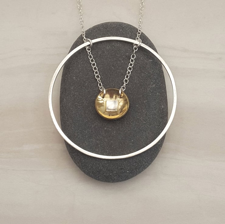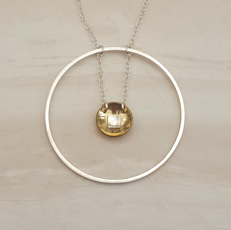 This lovely minimalist necklace has been discontinued to make way for some new designs. (Also, the silver circle is not completely flat; please see the 2nd picture). I created the piece by shaping sterling silver wire into a circle. Hanging from the wire is a domed circle of brass, with a square of sterling silver in the centre.