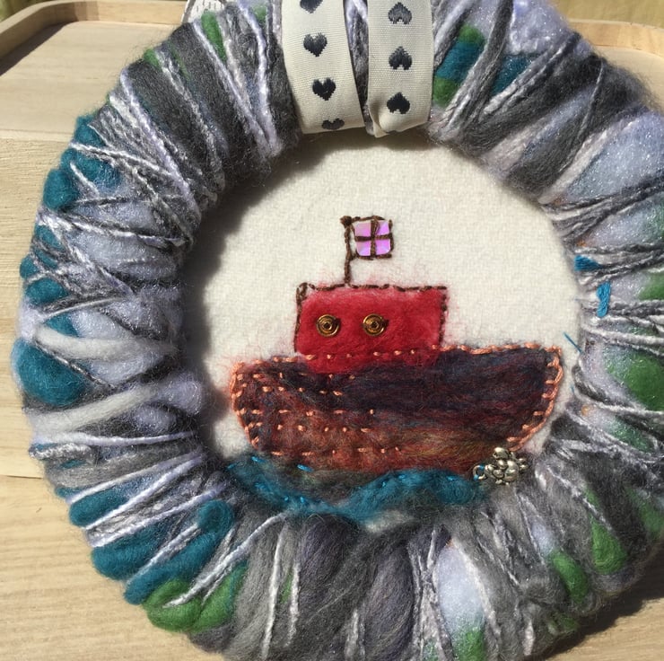 This is an original,one of a kind, needle-felted picture with a hand-made frame. The boat and sea are embellished with beads and the frame is wound with woollen tops and yarn. It is easily hung up using the attached ribbon. It measures approximately 18cms in diameter. I made this last summer after I’d been watching little tug boats down in Devon.