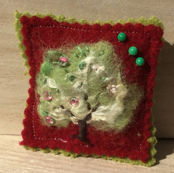 a teeny weeny pincushion perfect for those who like to appliqué. It can be bought as part of a set which includes the other year round seasons. It’s made of up-cycled wool fabric which has been needle-felted with a tree design. Beads have been used to embellish it.