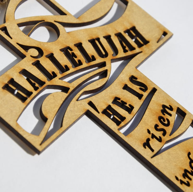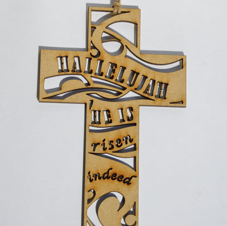 The cross is cut from 3mm laser-grade MDF and comes packaged in a 16x23cm cello bag with sage green card backing.