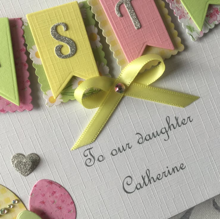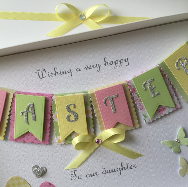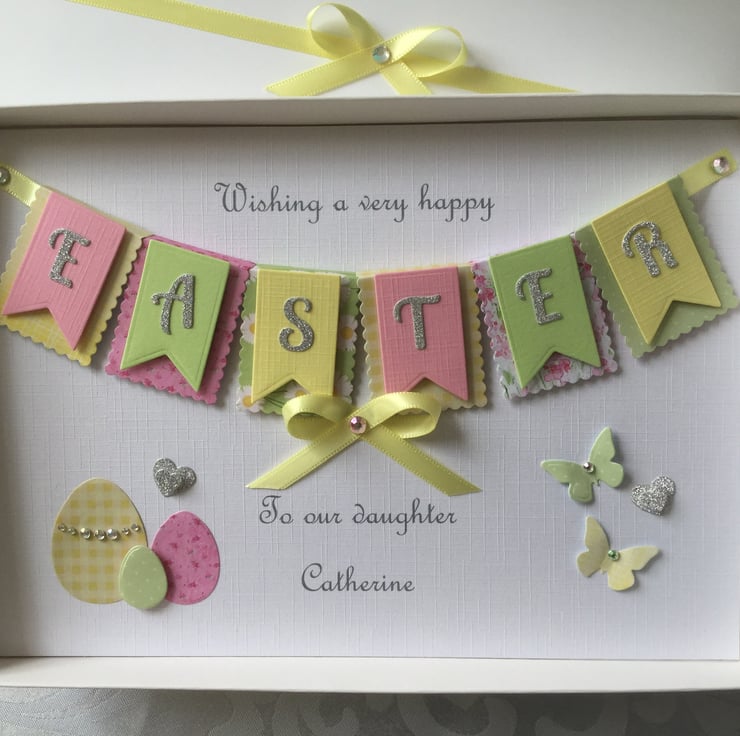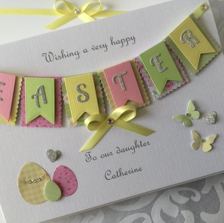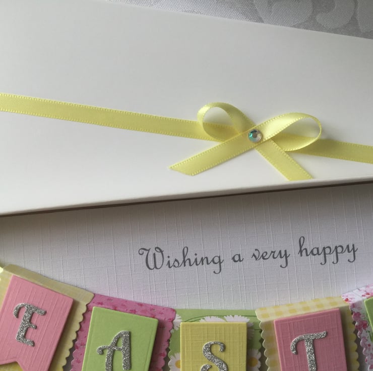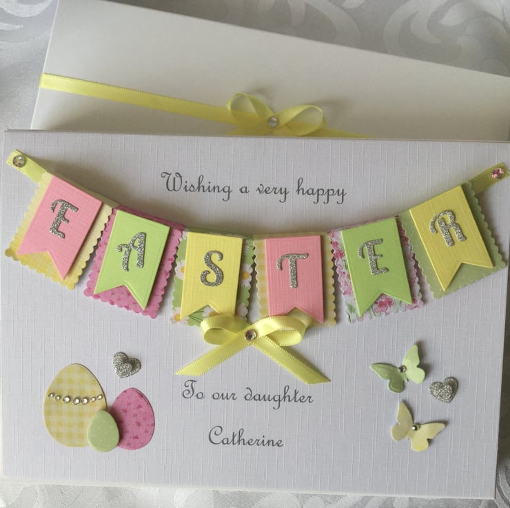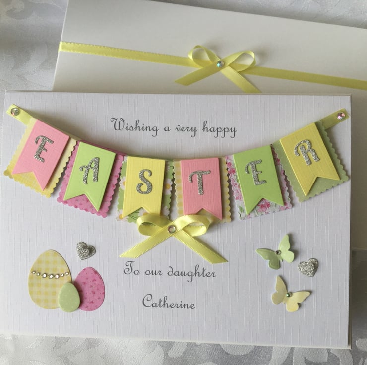 This handmade personalised Easter card is A5 in size ( 210mm x 150mm) and is on 300gsm heavyweight linen cardstock. I can personalise the text above and below the bunting for you. The card can be made for an individual, couple or family.