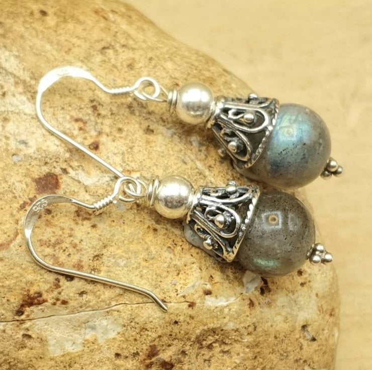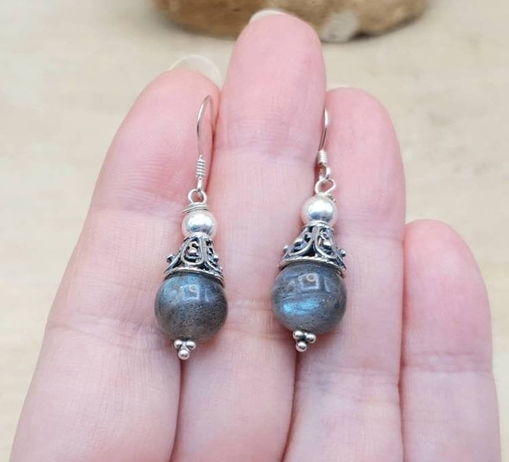 These are red black labradorite cone earrings. I have made these with Bali silver beads. Bali silver beads are handmade by the renown silversmiths of Bali and contains up to 99% silver. Bali silver is not hallmarked or stamped. Stones will vary from the photos.