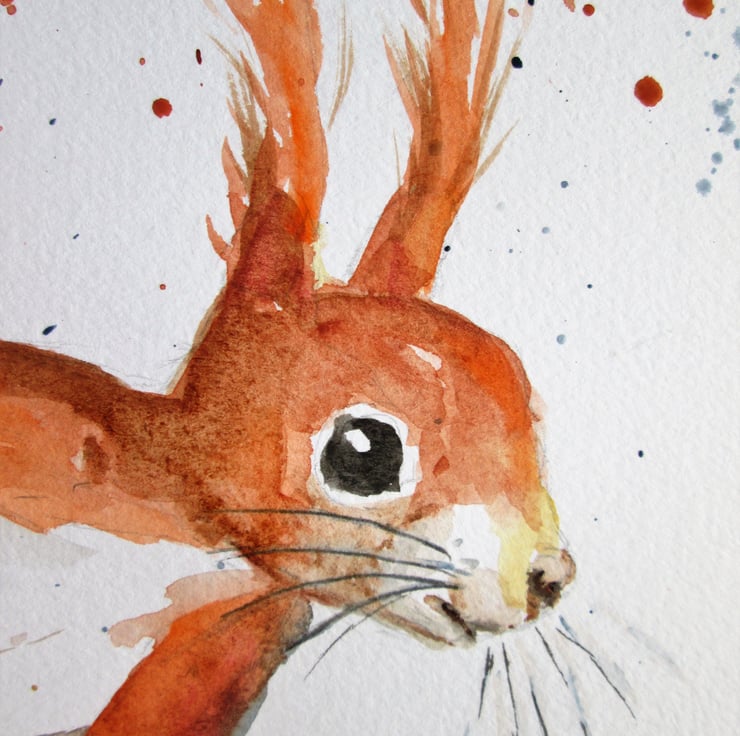 An original watercolour painting of a cute red squirrel peeking around a tree.