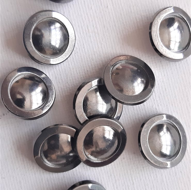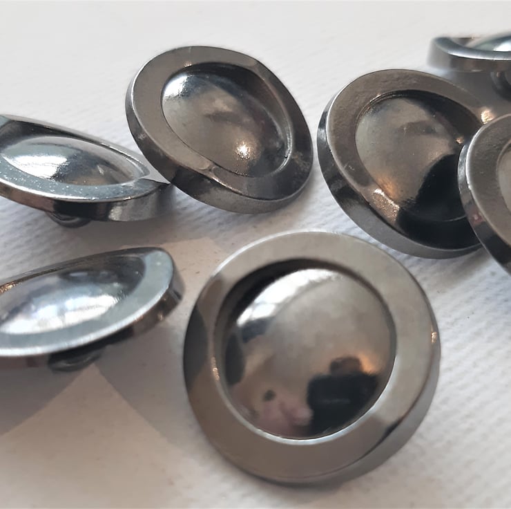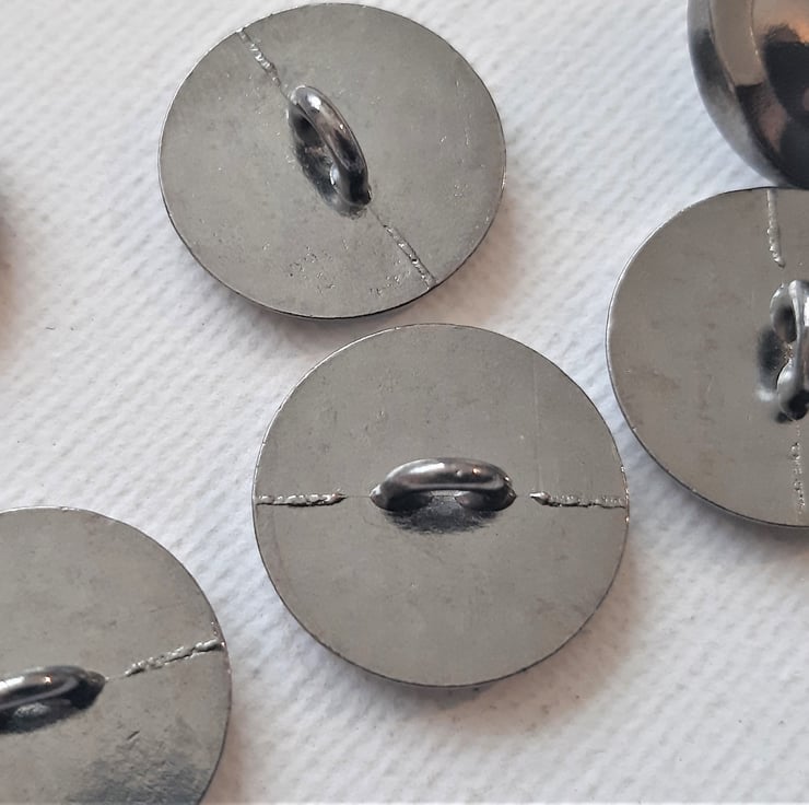 18mm diameter buttons, dark silver / gunmetal grey with a back shank (loop). Metal. New.