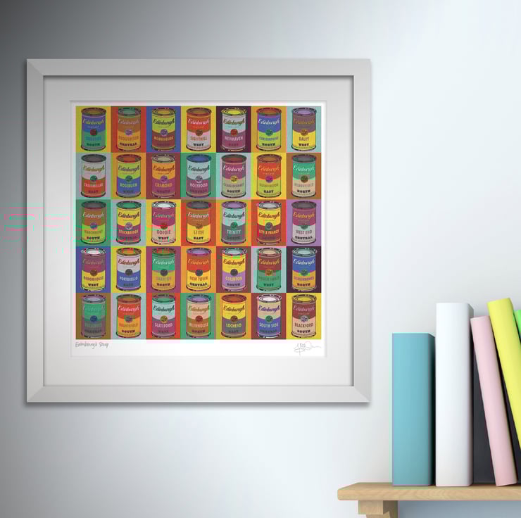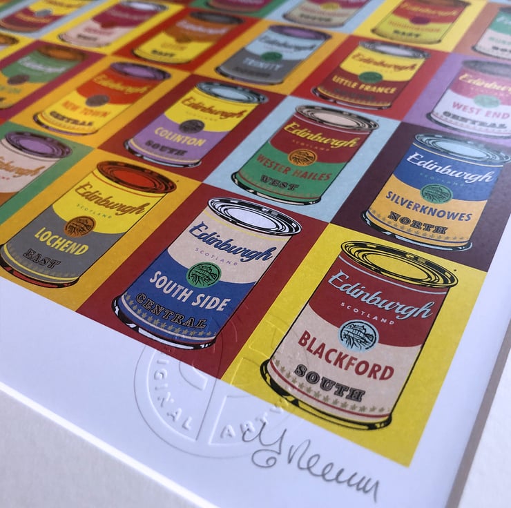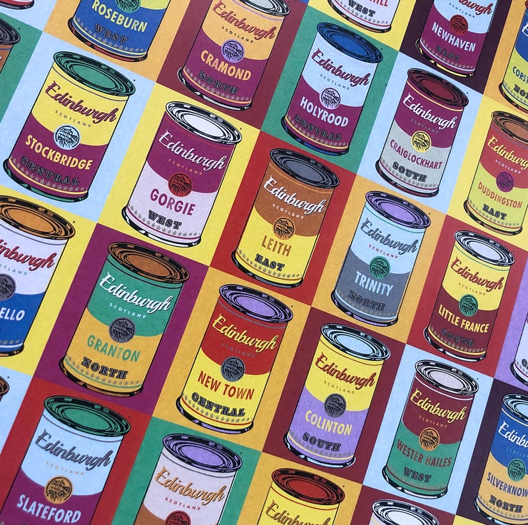 This vibrant, screen-print effect illustration includes thirty five areas of Edinburgh, including: