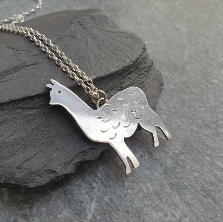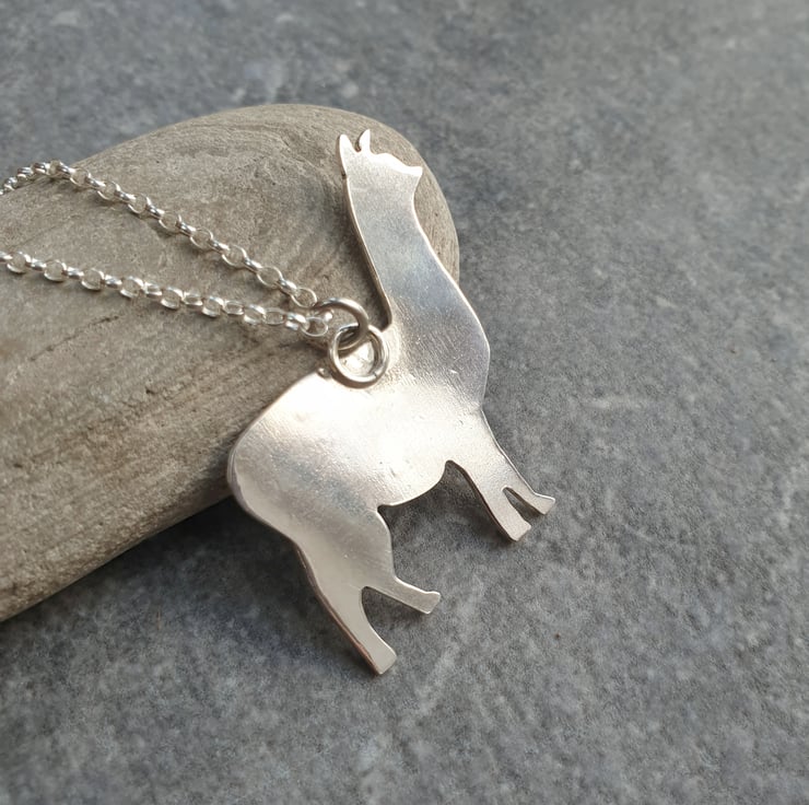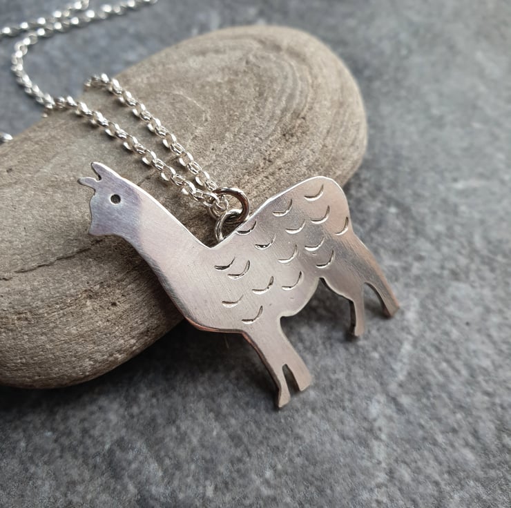 This sweet alpaca pendant has been handcrafted from thick sterling silver sheet. I cut the shape, filed and smoothed it before adding the fine detail. The pendant hangs from a sterling silver chain in your choice of length and has been given a highly polished finish.
