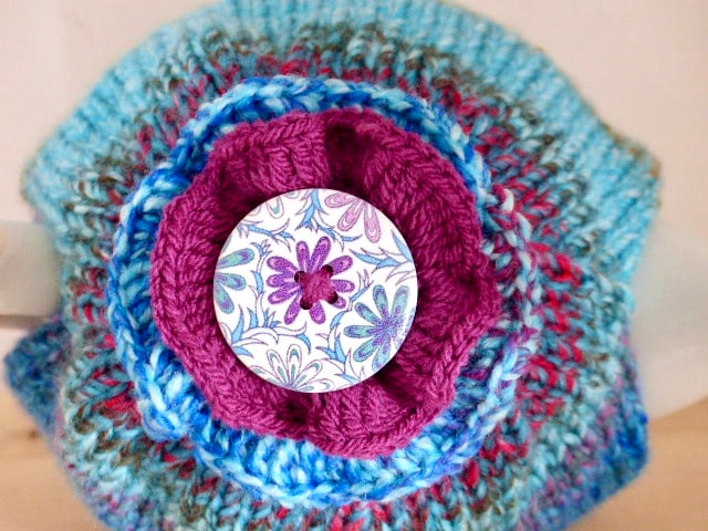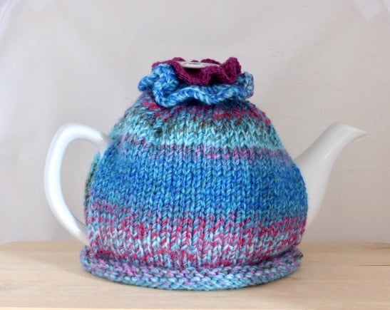A hand knitted tea cosy in a bright chunky self patterning yarn topped with a crocheted flower. The outer layer of the flower is in the same yarn as the body of the cosy and the inner layer is in magenta and it has a large wooden co-ordinating button in the centre. The colours range from turquoise, purples and pinks. I have knitted this item to fit a standard five cup pot but it has plenty of stretch and a roll rim so should fit a variety of styles of pot. Just slip it over your teapot as it has slits for the handle and spout.