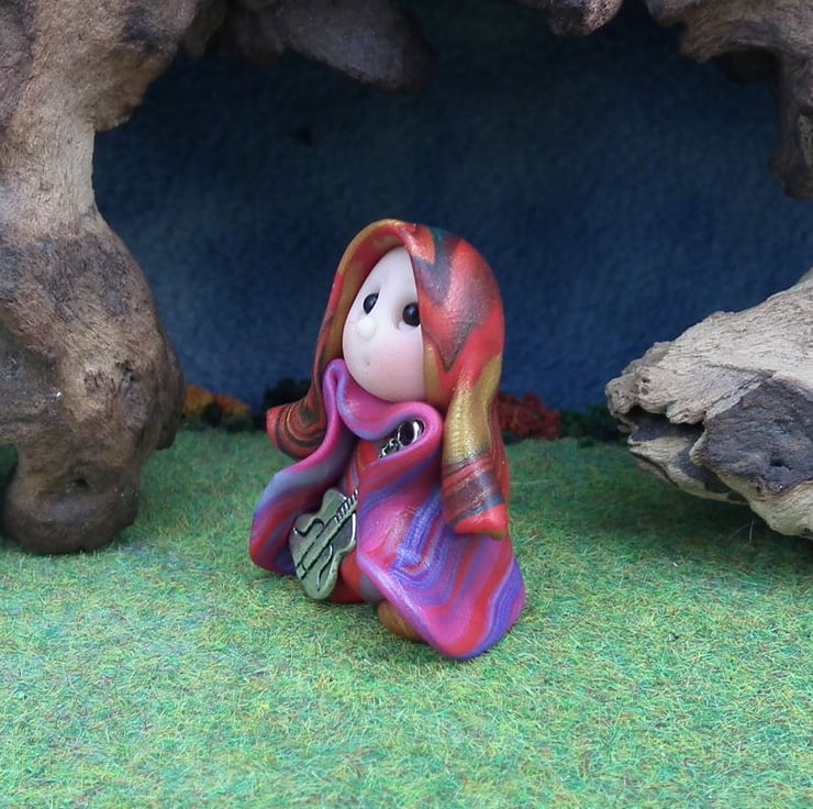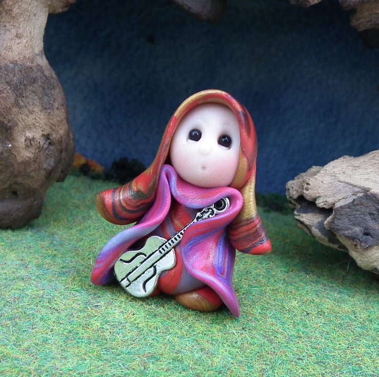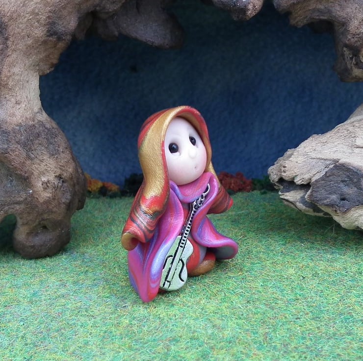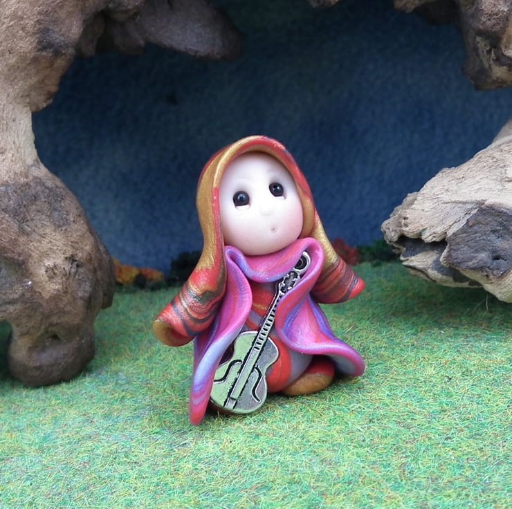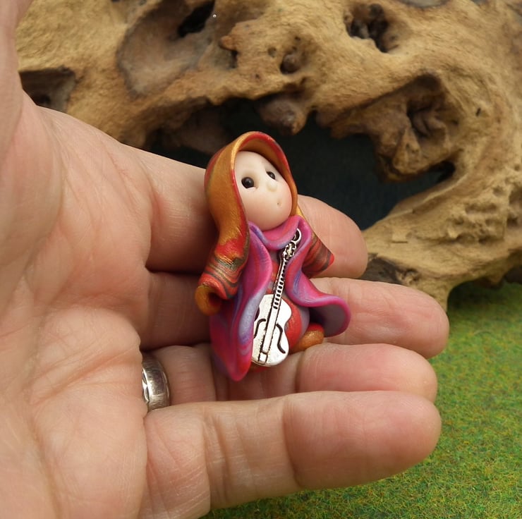 This is a 'one of a kind' creation having been entirely handmade without the use of moulds here at my studio on the Sussex Coast. Modelled with Prosculpt polymers, painted with heat set paints before sealing with lacquer, Renne has sparkling black onyx eyes and a silver metal guitar. He is just one and a half inches tall and has been instructed not to make any noise in transit ...