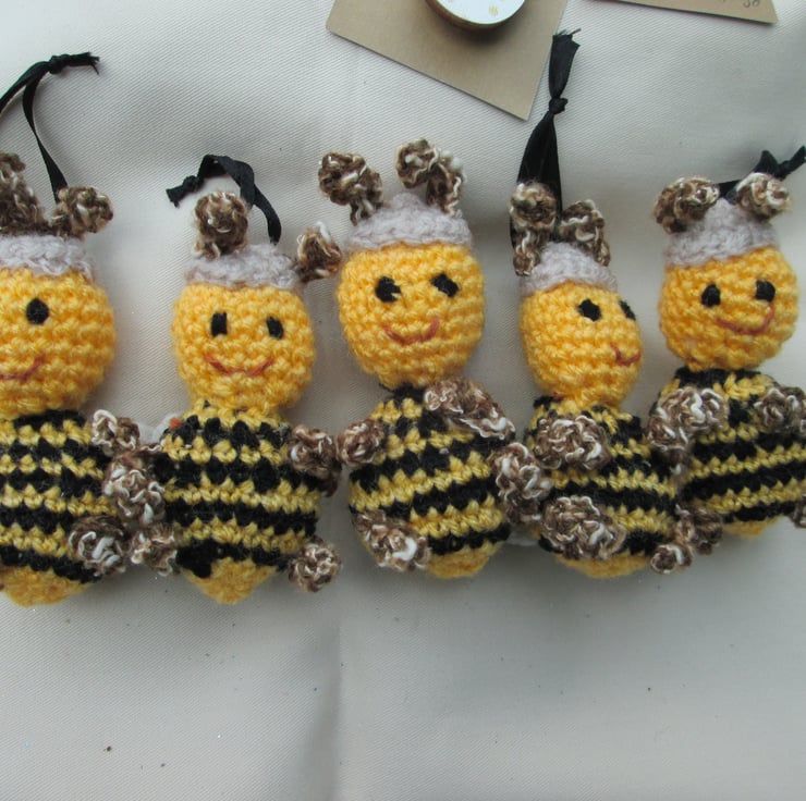 These Lavender bag bees are crocheted in wool and filled with lavender to keep the moths away from your precious woollens. They have a ribbon to hang them up.