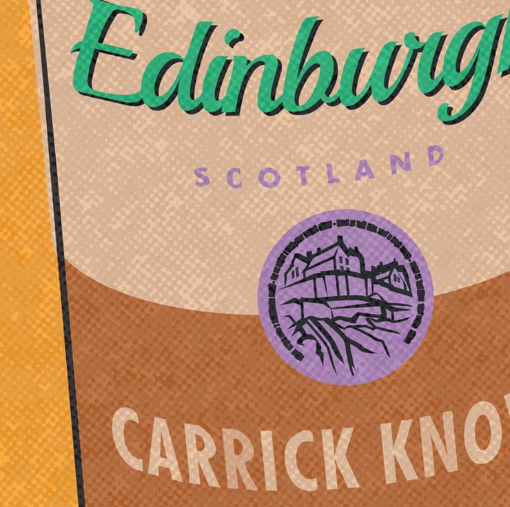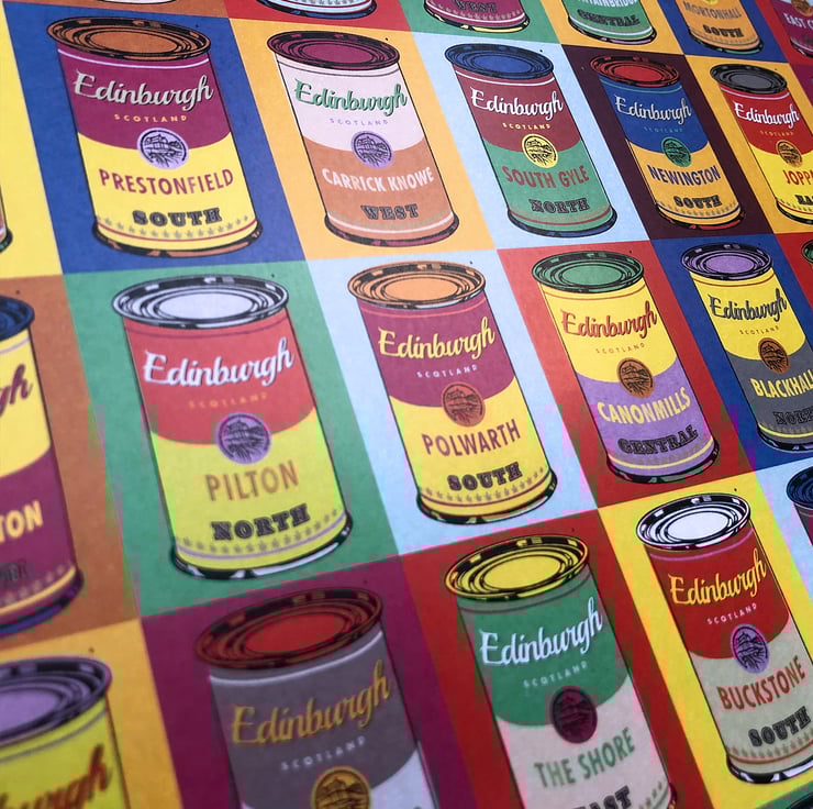 This vibrant, screen-print effect illustration includes thirty five areas of Edinburgh, including: