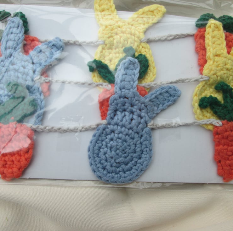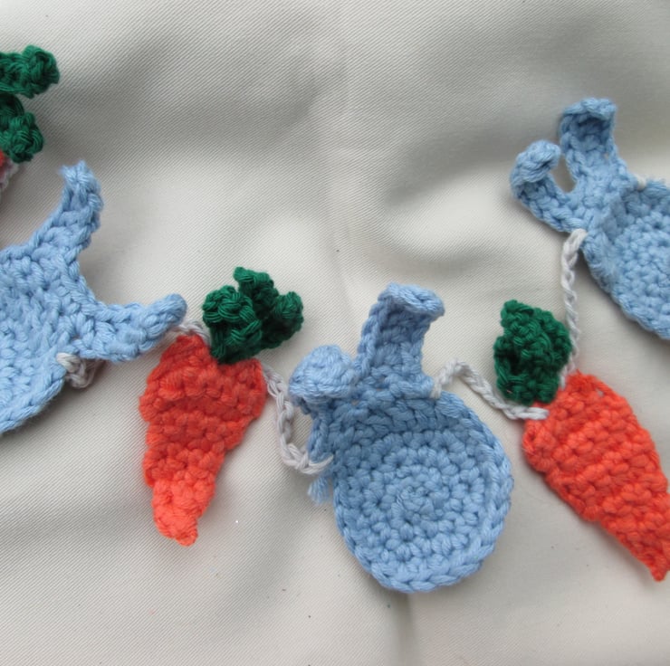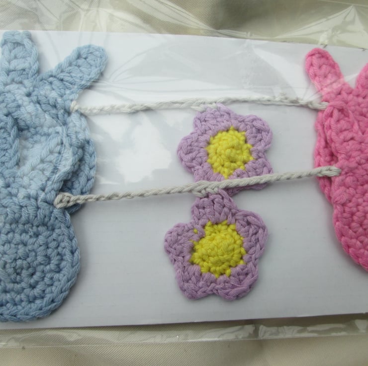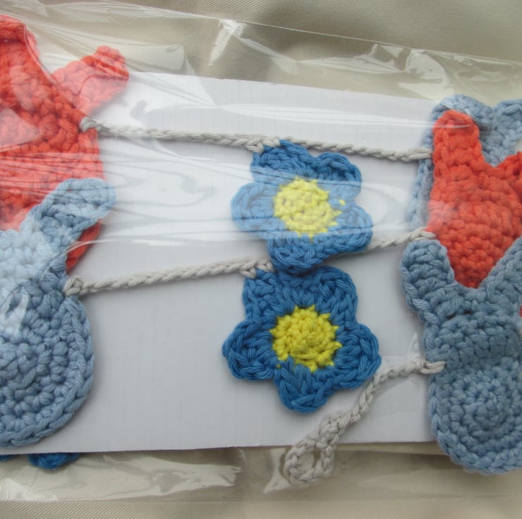 This bunting comes in various shapes including Bunnies,flowers and carrots. Brighten up your Easter decorations. It is 90cm /3ft long with loops each end to hang up. Made from cotton thread crocheted together would make a lovely gift.