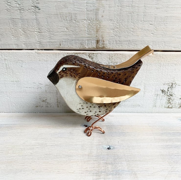 Handmade wooden Wren. Each of my little wooden birds are carefully hand crafted and hand painted with metal wings and wire feet.