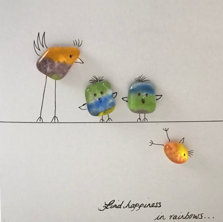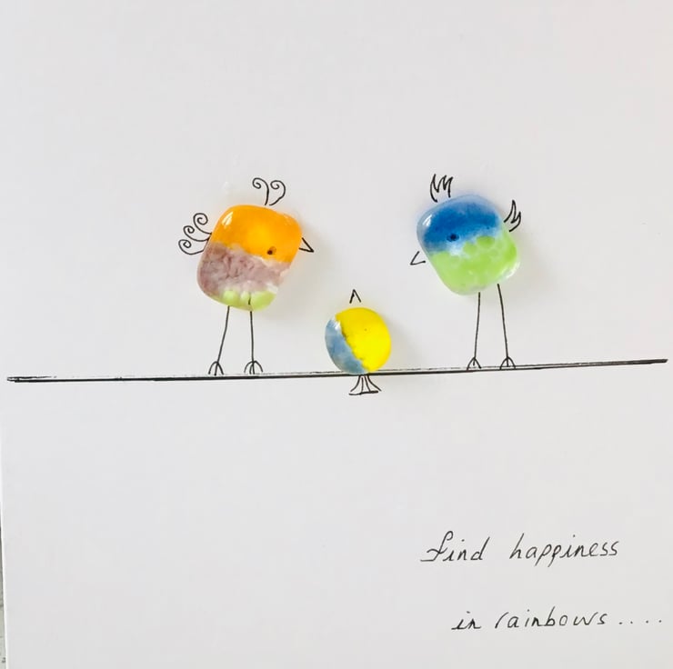 Fused glass rainbow birds card with envelope in cellopane sleeve. Perfect to send to someone who needs cheering up .the cards can be framed after use into a small box frame. Beautifully cute and shiny . Please specify if you have a preference otherwise one will be chosen at random . Cards can be sent direct to recipient just add address and message you would like in comments