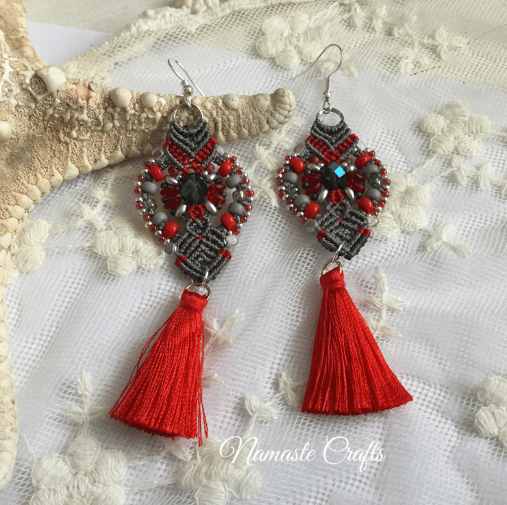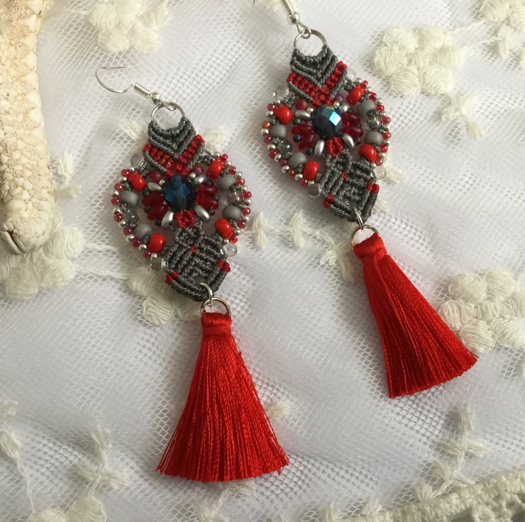 These lovely hand beaded micro macrame earrings have been made using the best quality materials in delicate shades of red and grey and will make a real statement. Perfect for a Summer occasion, holiday or match with an evening outfit.