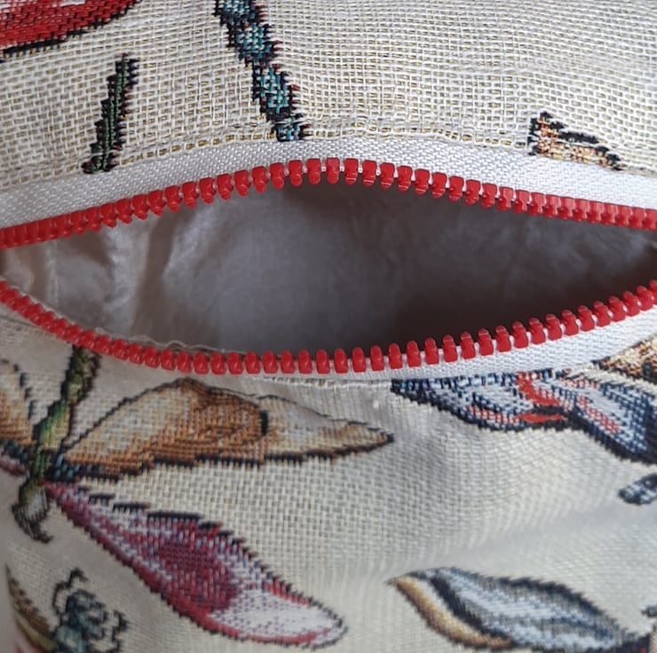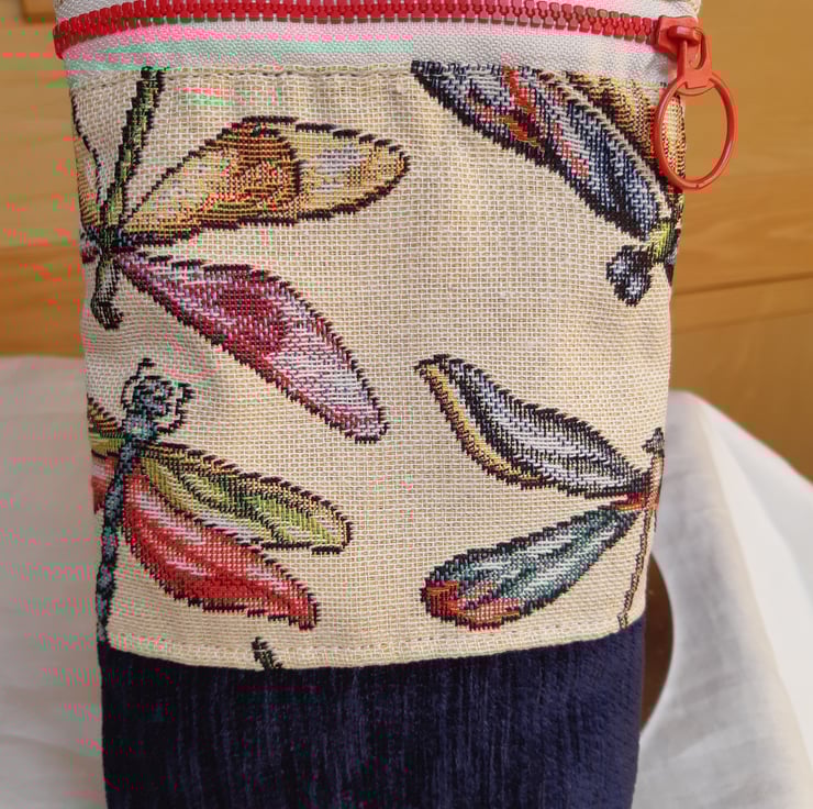 Zipped crochet hook bag, made with navy chenille, woven tapestry fabric and a biege satin lining.