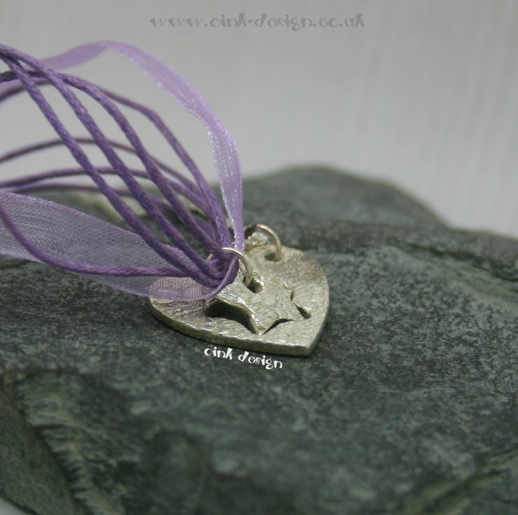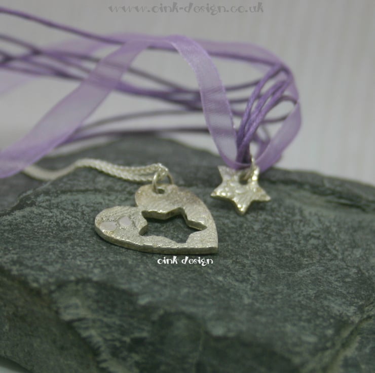 A star is cut from the heart so the pattern runs across the two pendants, so only these two pendants fit together perfectly.