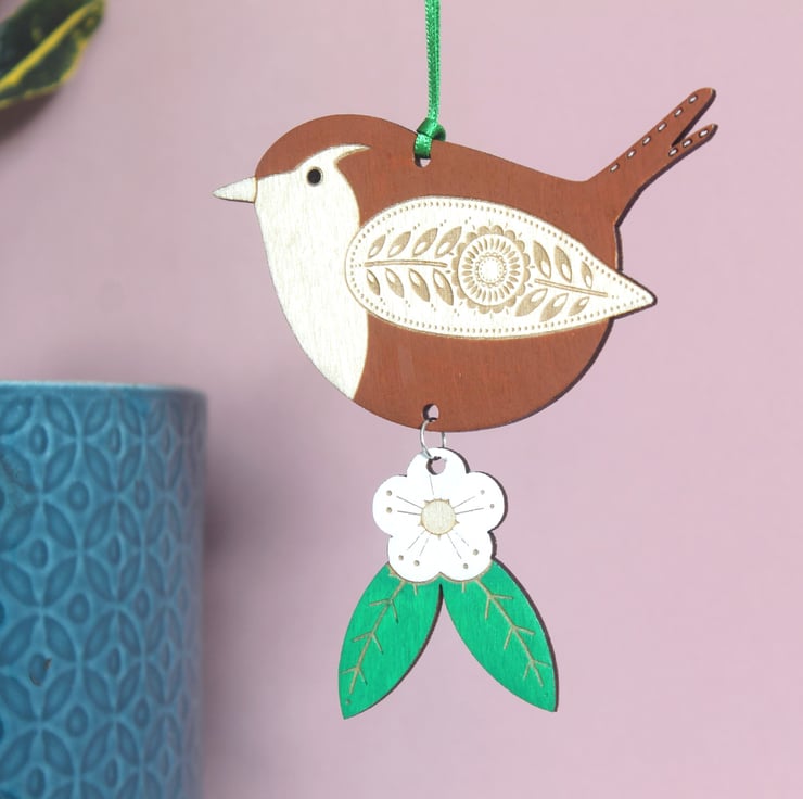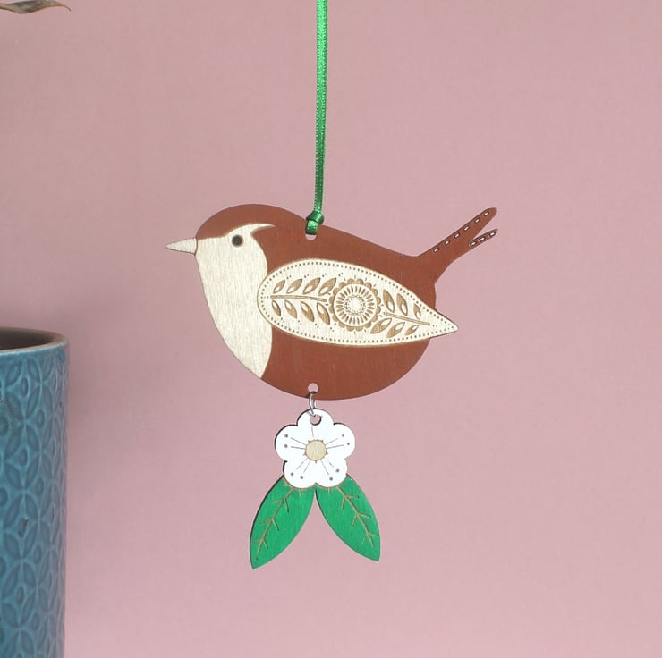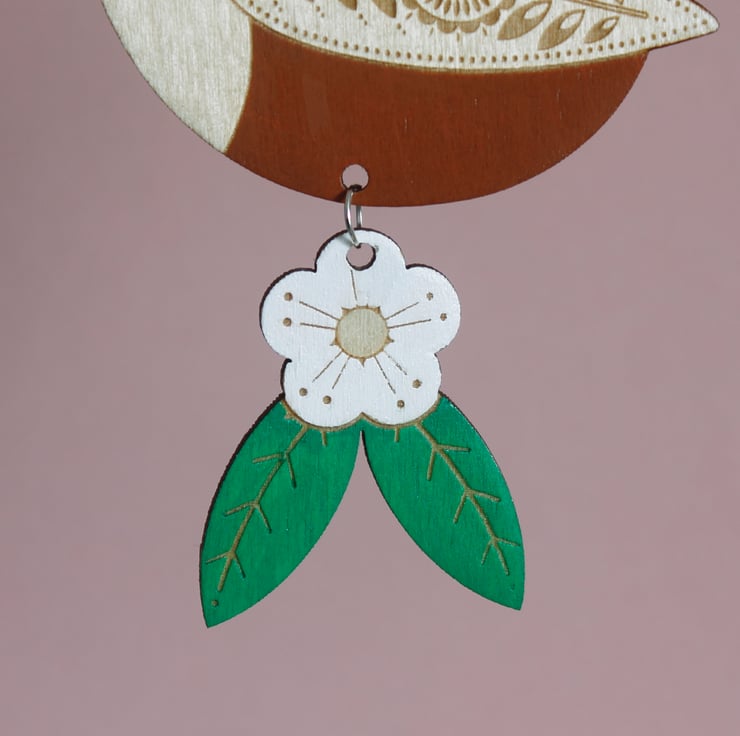 Cut and etched from 3mm birch ply, she has been hand painted in a light brown with little white tail markings. Her wing has been etched with a pretty leafy pattern. She also has a little hawthorn flower with leaves, which hangs under her belly.
