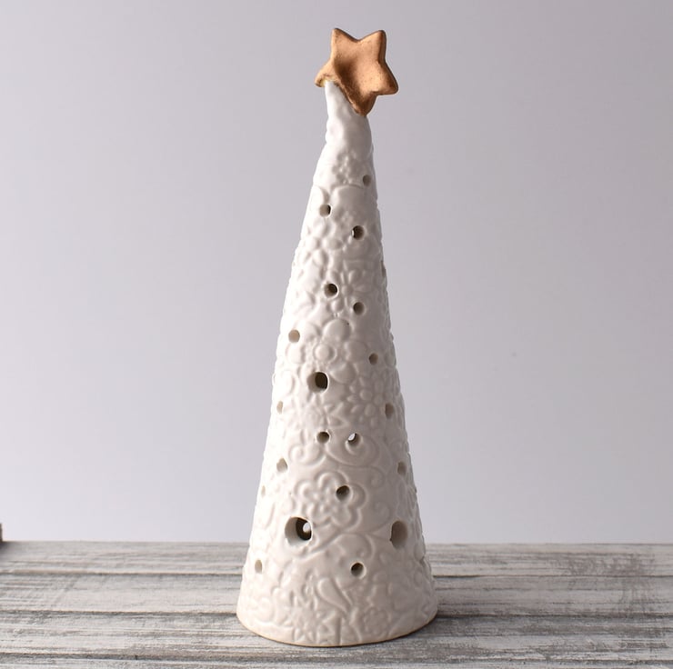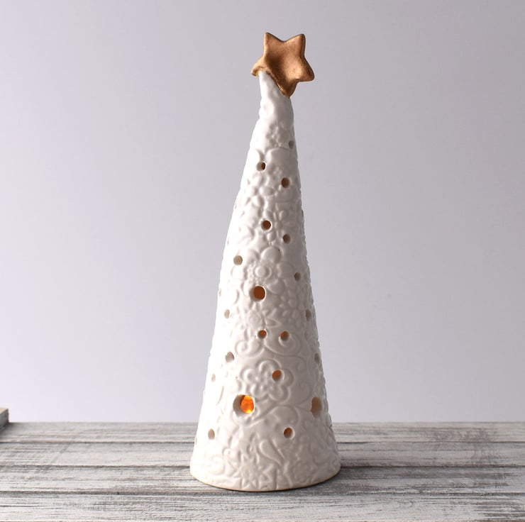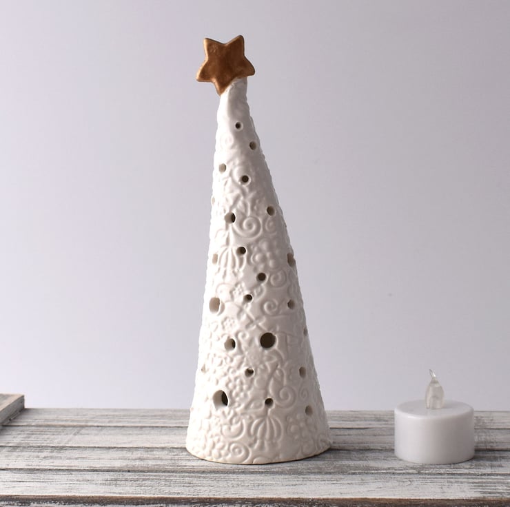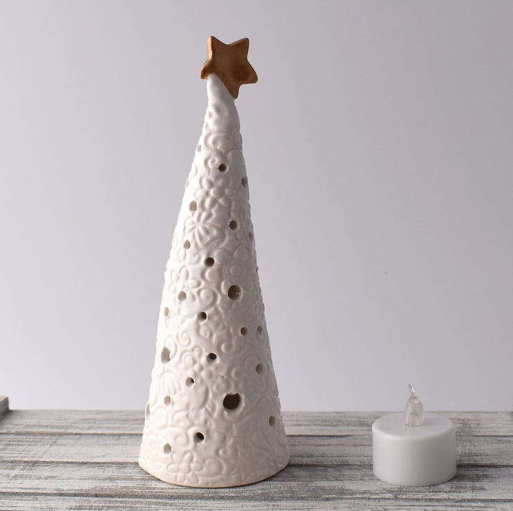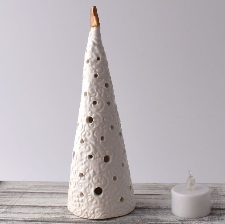 A cone shaped pottery Christmas tree with LED tea light included, standing around 19cm tall.