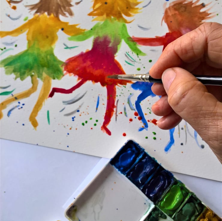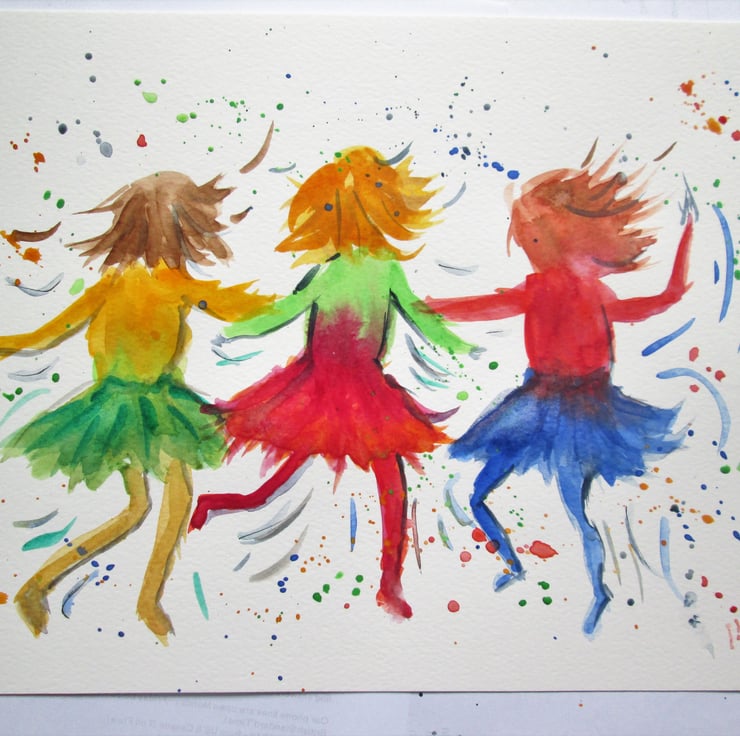 A colourful cheerful painting for children. A jolly scene with girls dancing at a party.