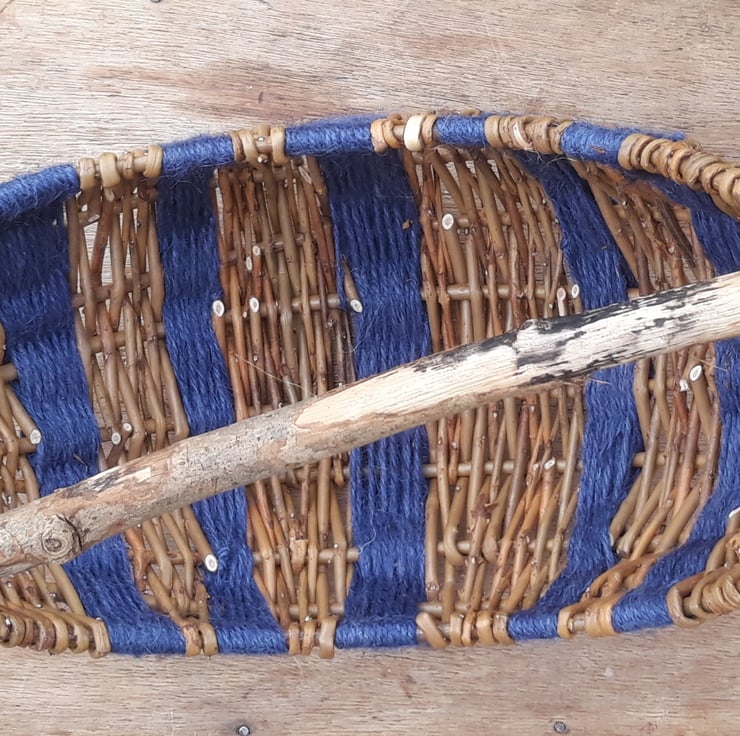 English willow, blue jute & driftwood handle basket length 21cm width 8cm depth 3.5cm