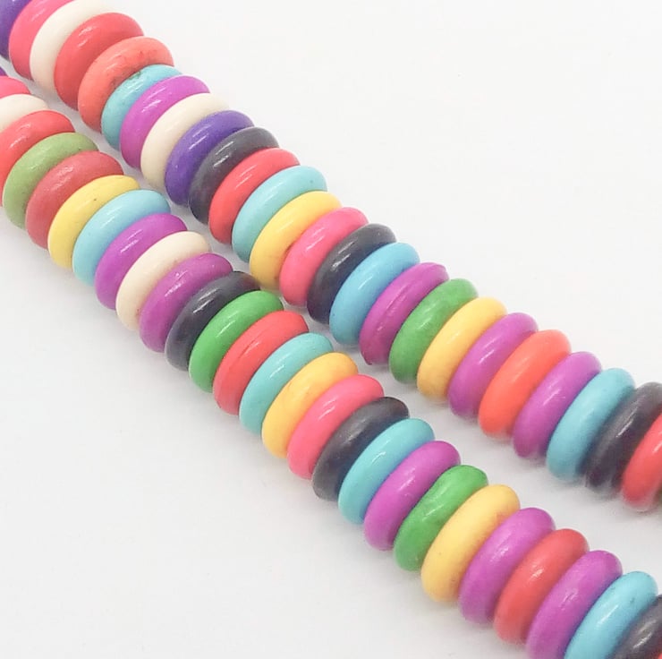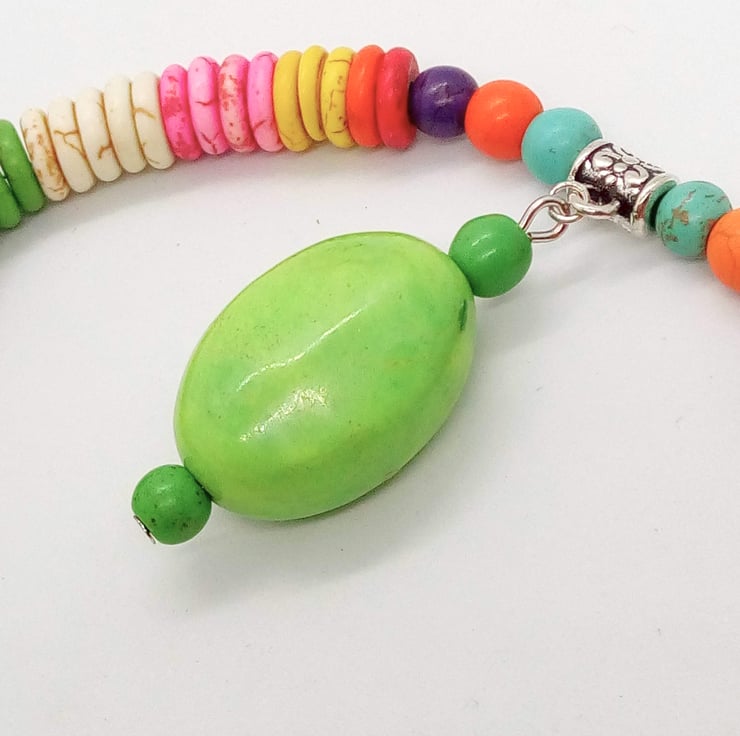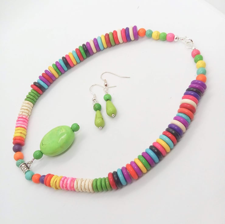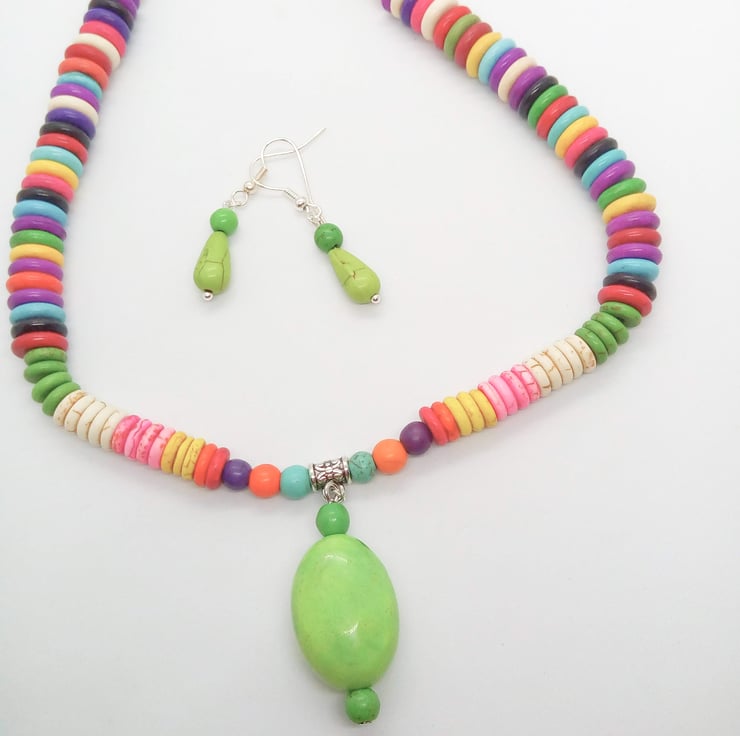 This pretty colourful jewellery set is made using multicoloured 10mm and 8mm dyed howlite disc beads and 6mm round multi coloured dyed howlite round beads with a pendant made with a 30mm x 18mm puffed oval bright green bead and a 6mm green bead. The earrings have a 6mm green round dyed howlite bead and an 18mm x 8mm teardrop dyed howlite bead. The necklace is fastened with a silver plated lobster clasp and the earrings have silver plated ear wires.