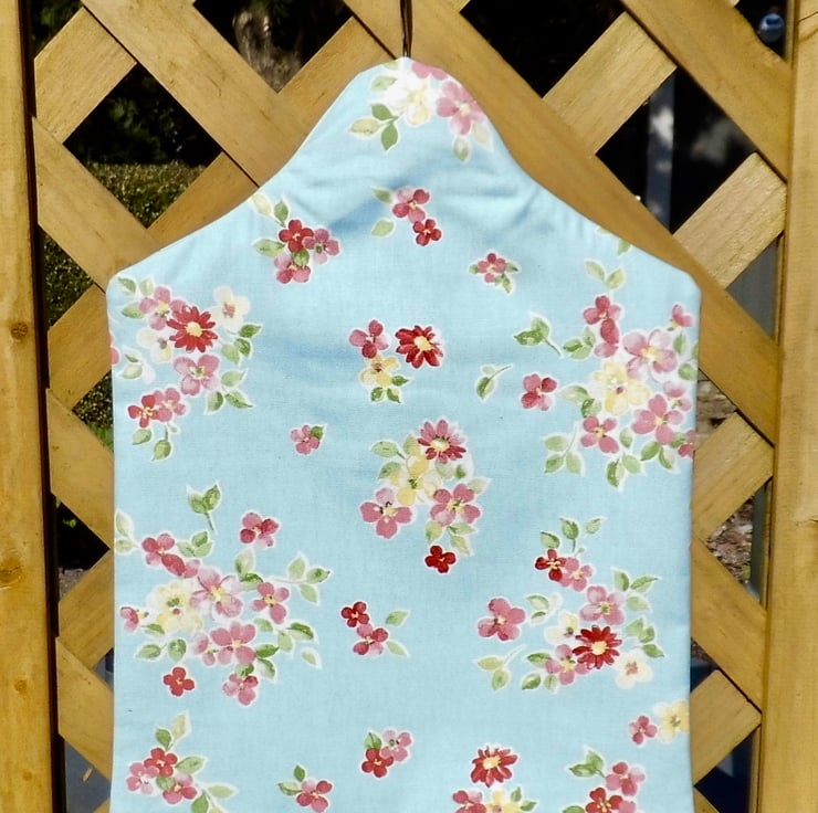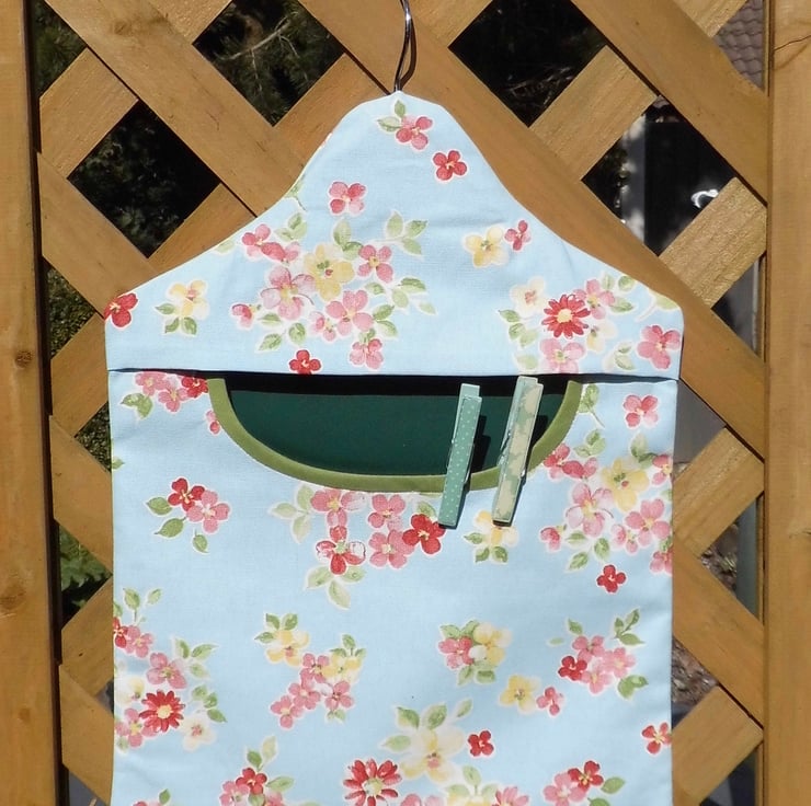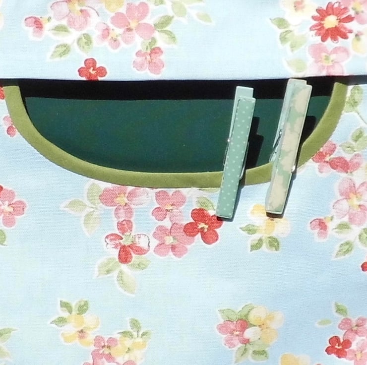 This peg bag has been made from a furnishing weight blue floral cotton fabric. Blue background with fresh floral posies. The back is lined with a dark green fabric and you can see this through the opening. The front is lined with white cotton.
