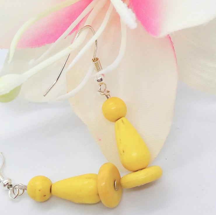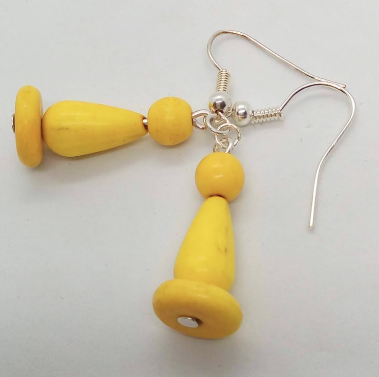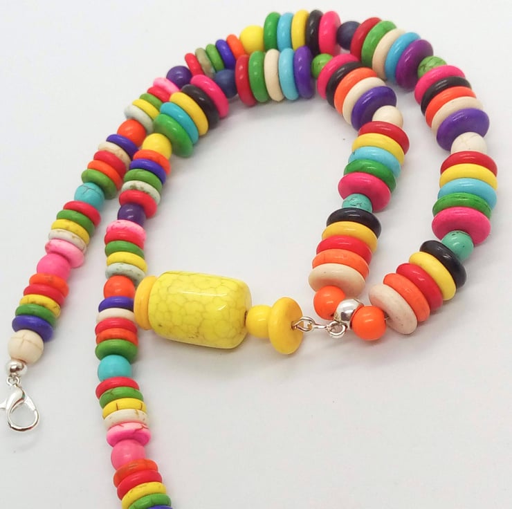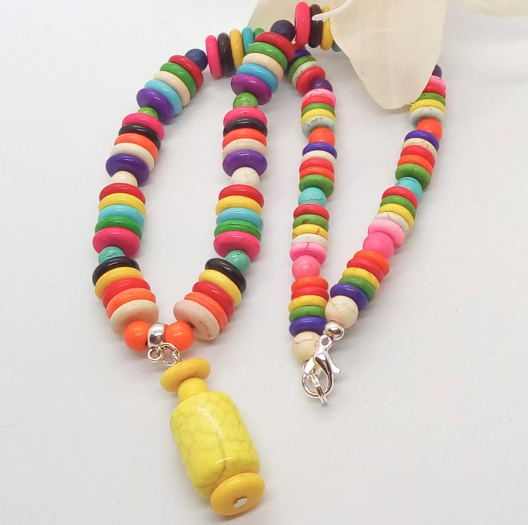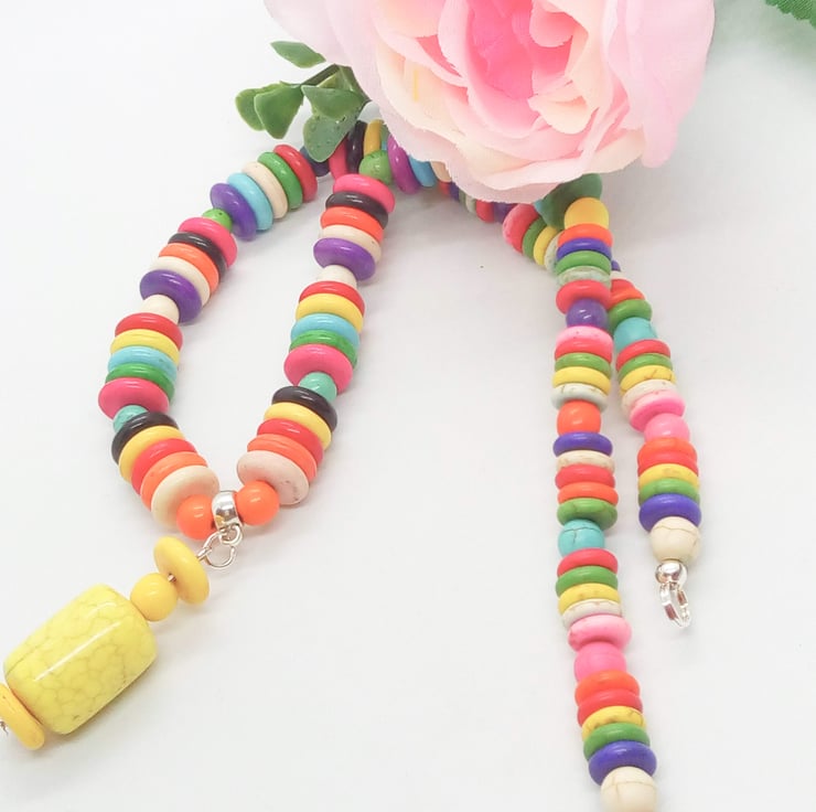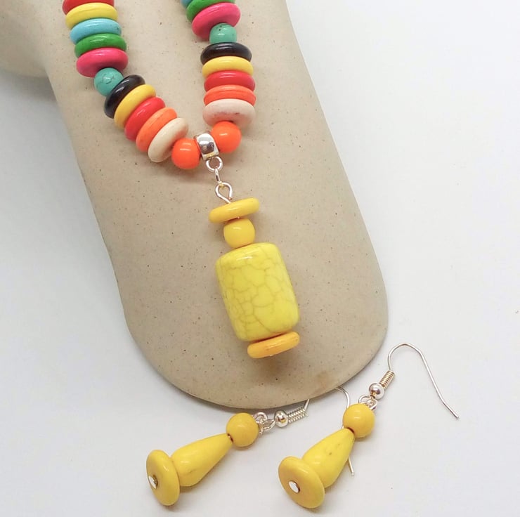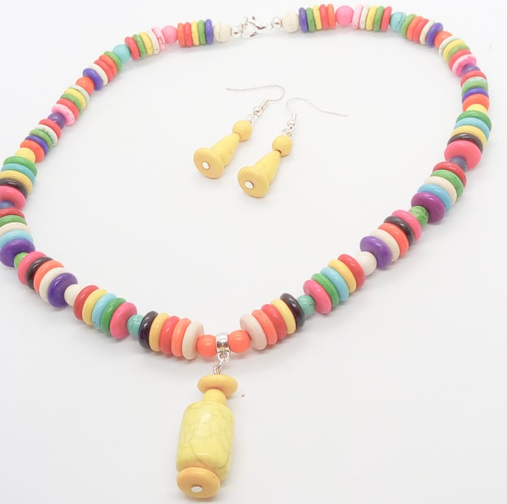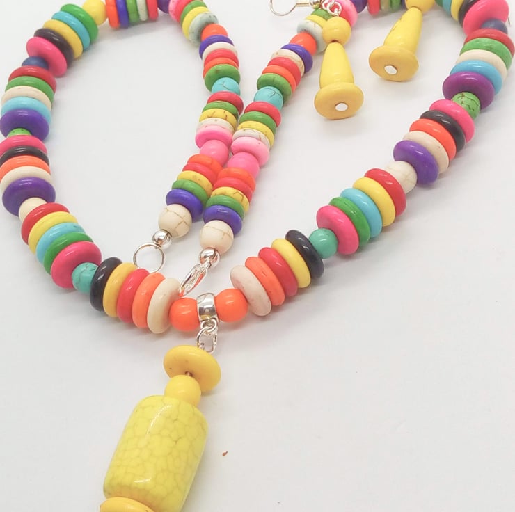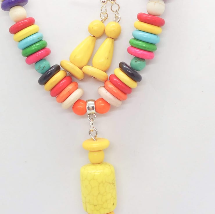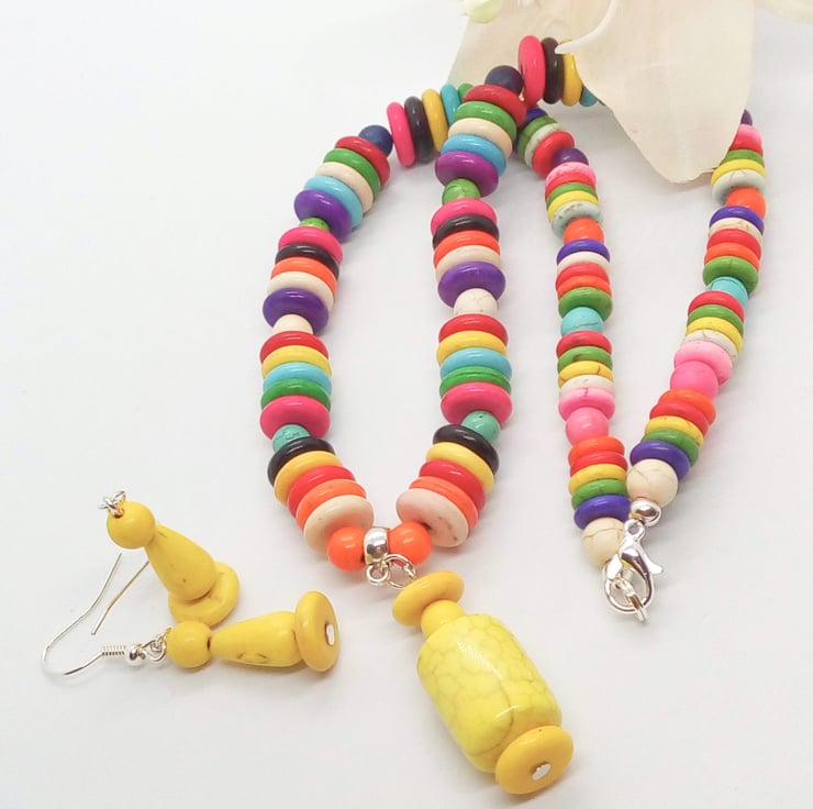 This pretty colourful jewellery set is made using multicoloured 10mm and 8mm dyed howlite disc beads and 6mm round multi coloured dyed howlite round beads with a pendant made with a 18mm x 15mm yellow dyed howlite drum bead, two 10mm yellow dyed howlite disc beads and a 6mm yellow bead. The earrings have a 6mm yellow round dyed howlite bead a 10mm dyed howlite disc bead and an 18mm x 8mm teardrop dyed howlite bead. The necklace is fastened with a silver plated lobster clasp and the earrings have silver plated ear wires.