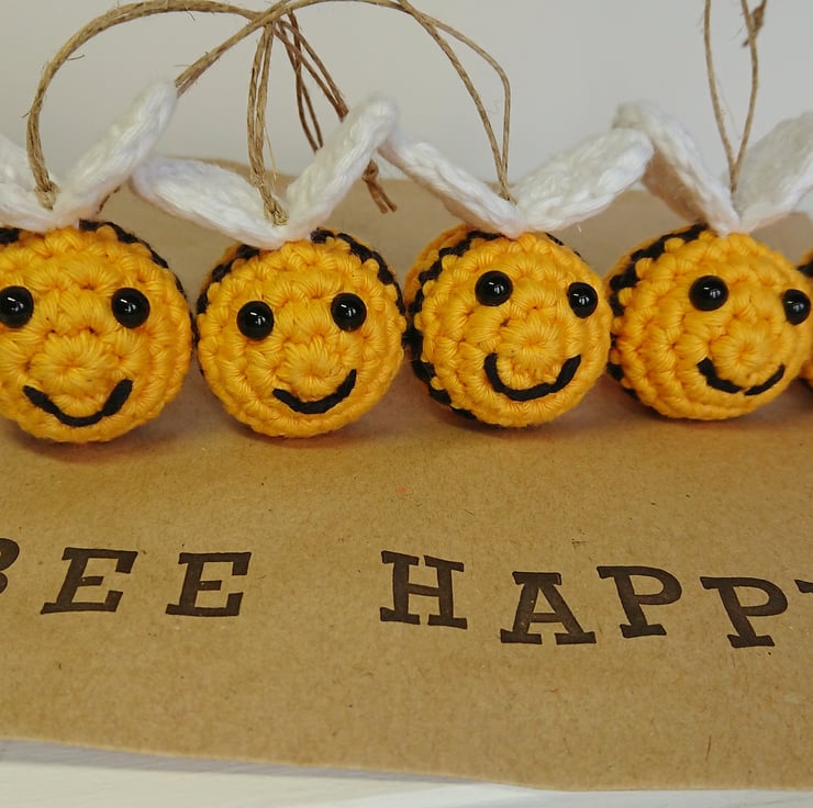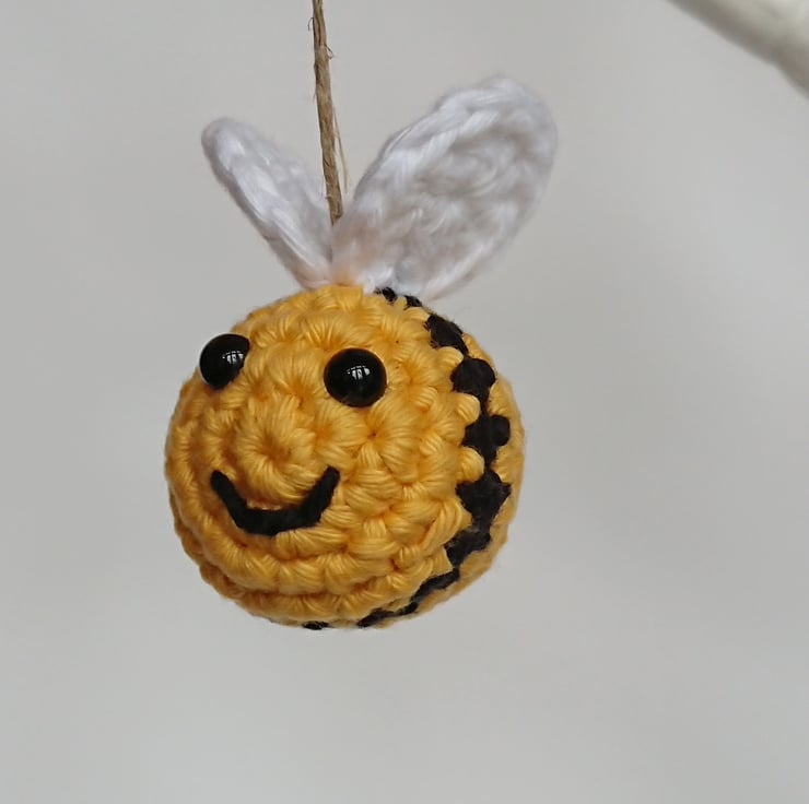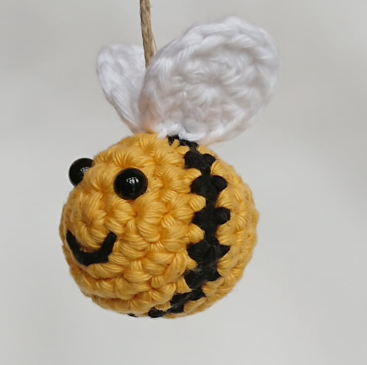 A cute amigurumi bee hanging decoration made in vibrant cotton yarn with safety eyes, and a twine hanging loop.
