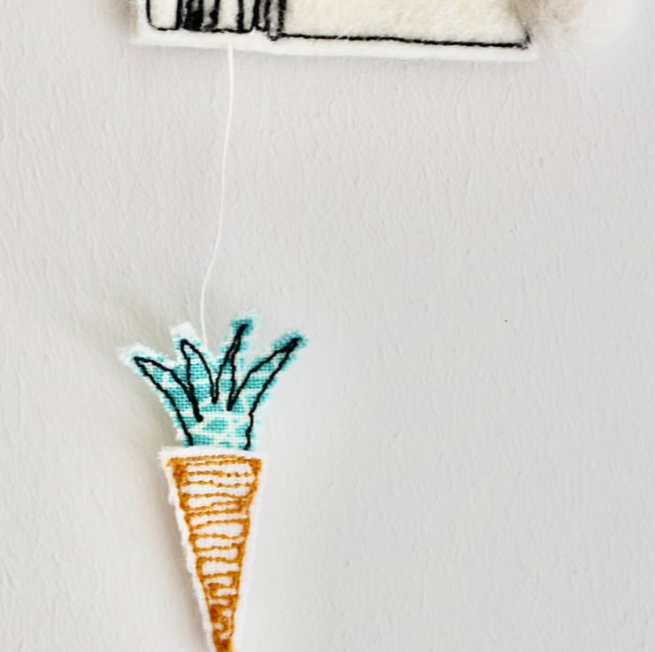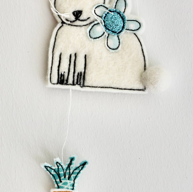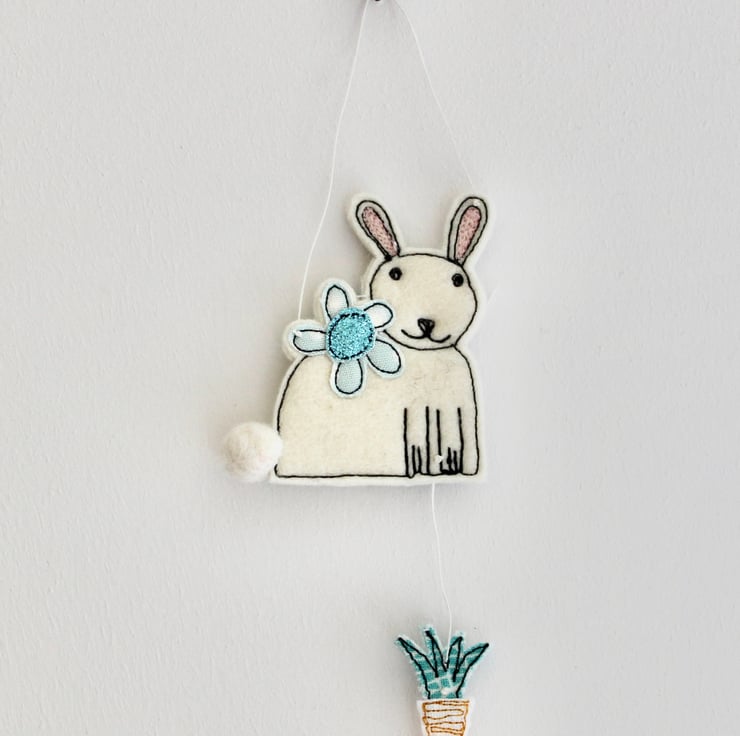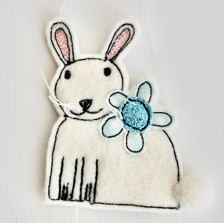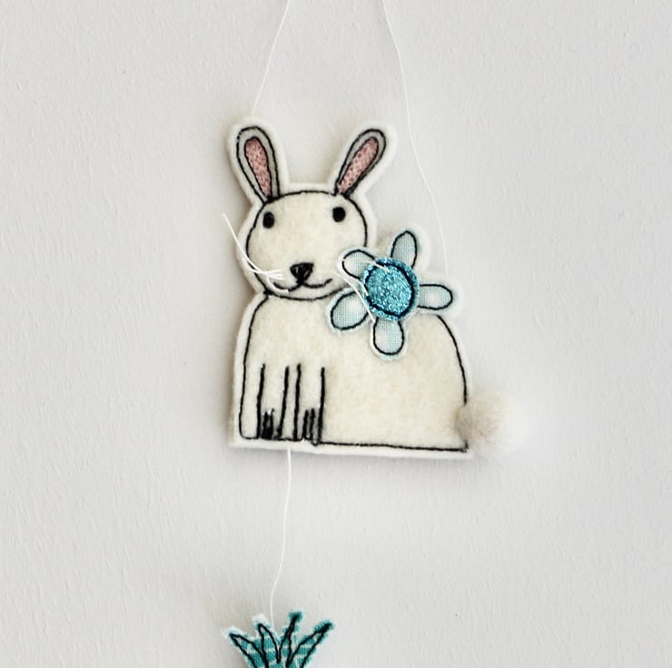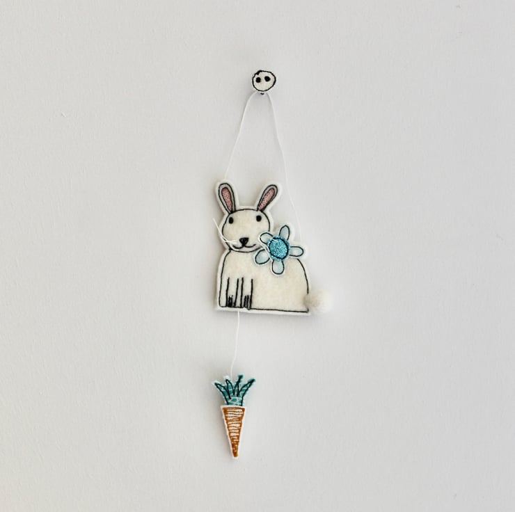 Little bunny is sewn using 100% wool felt, cotton cloth and free hand machine embroidery; with a sewn fabric carrot, a 100% wool felt ball tail, thread whiskers and a linen string to hang.