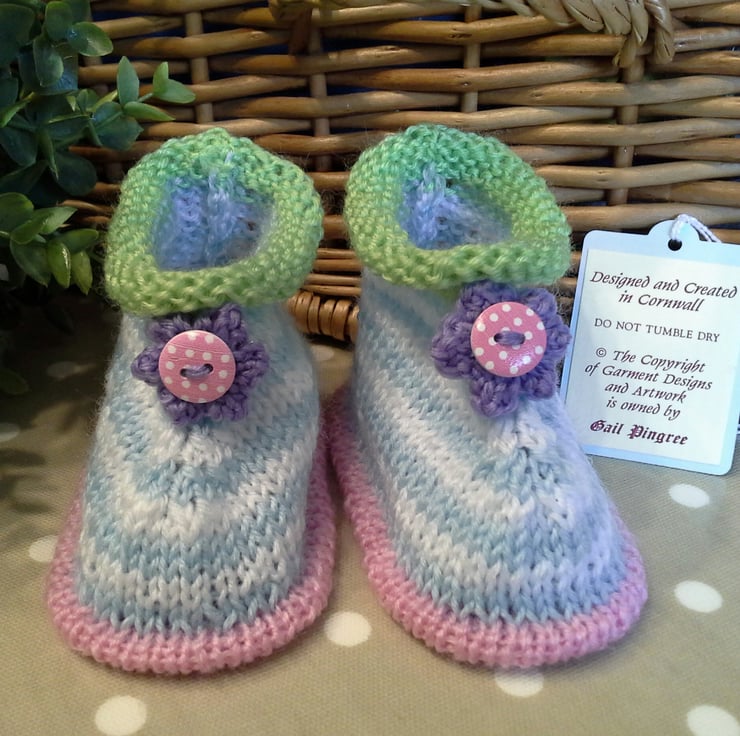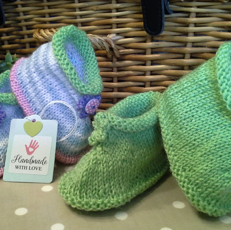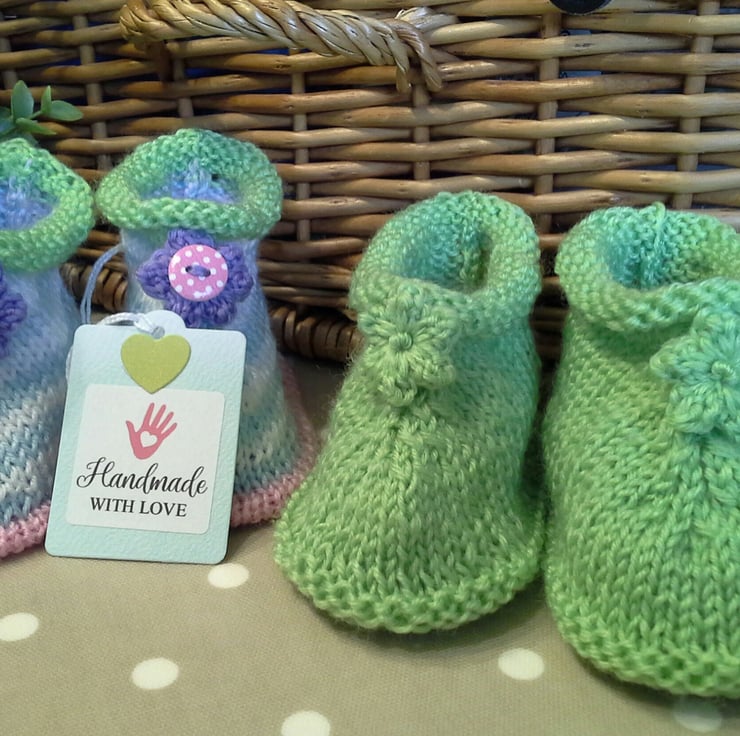 An adorable eye catching two pair baby booties pack lovingly designed and hand crafted using a premium yarn mix of 50% cotton, 50% acrylic. All yarns used are machine washable at low temperature settings. The trim buttons are made from genuine wood with a polkadot design on them. The apple green booties have two hand crotchet flowers with French embroidery knots in the centres.