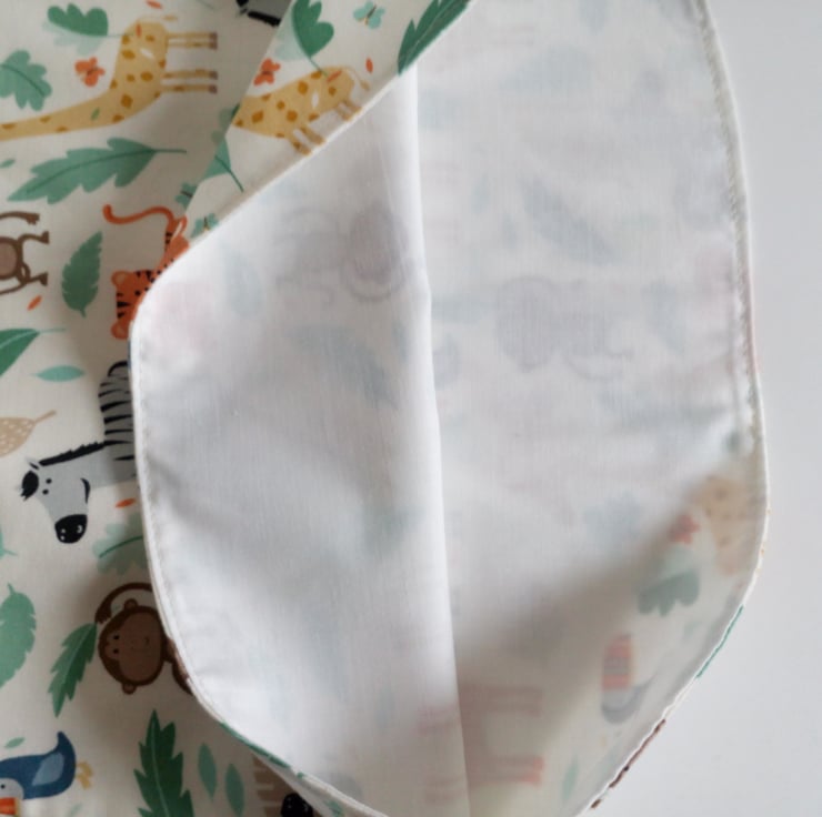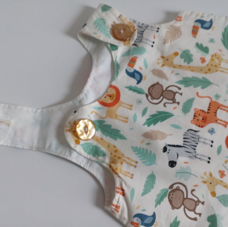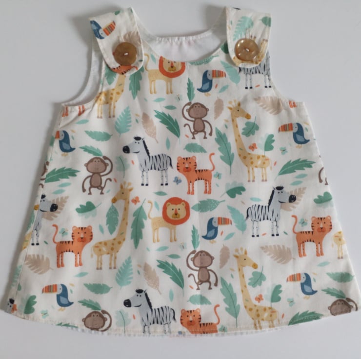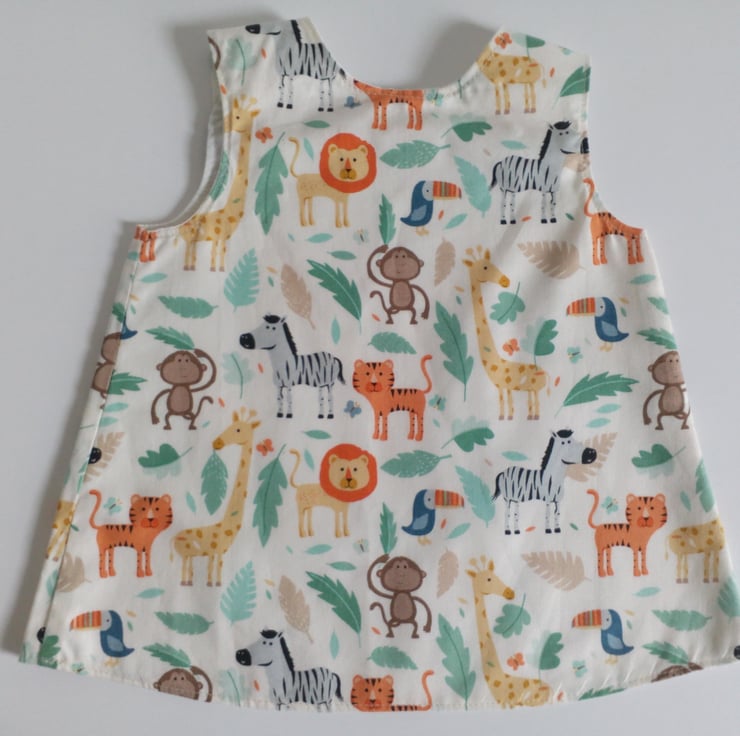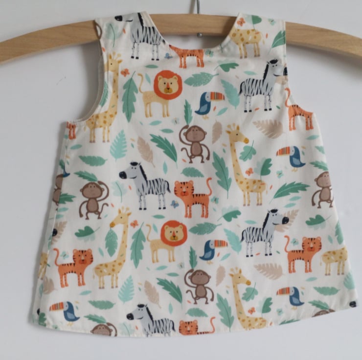A line style dress/pinafore in an animal print design fabric. Fully lined.