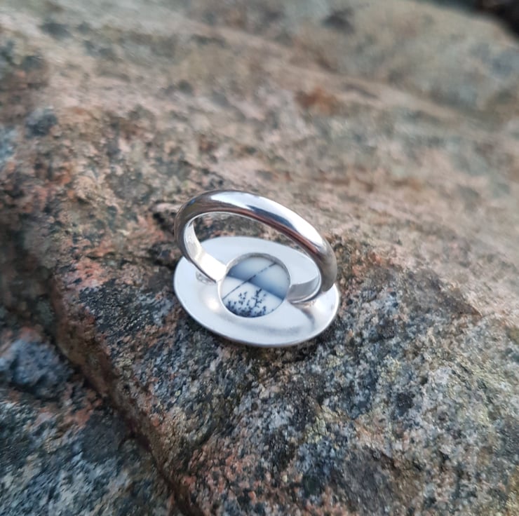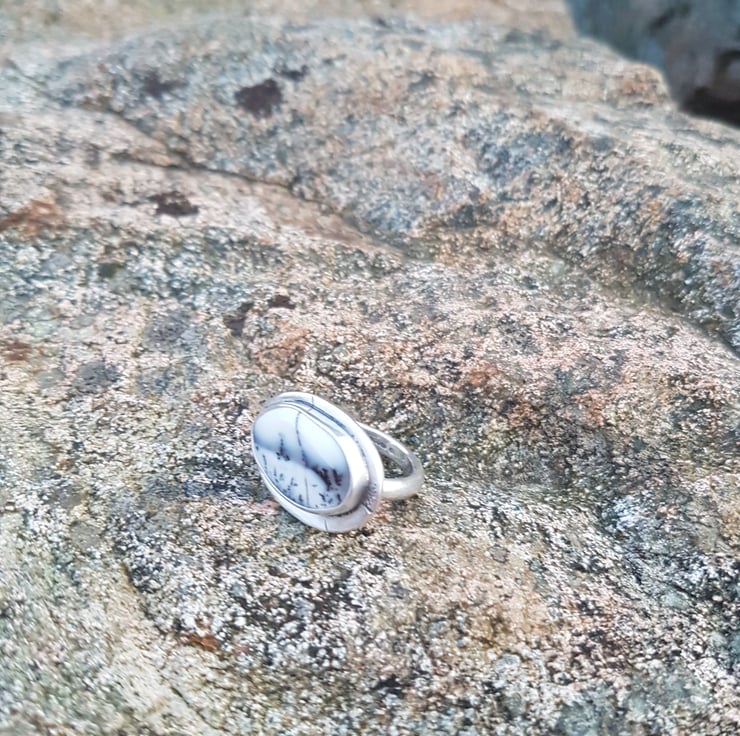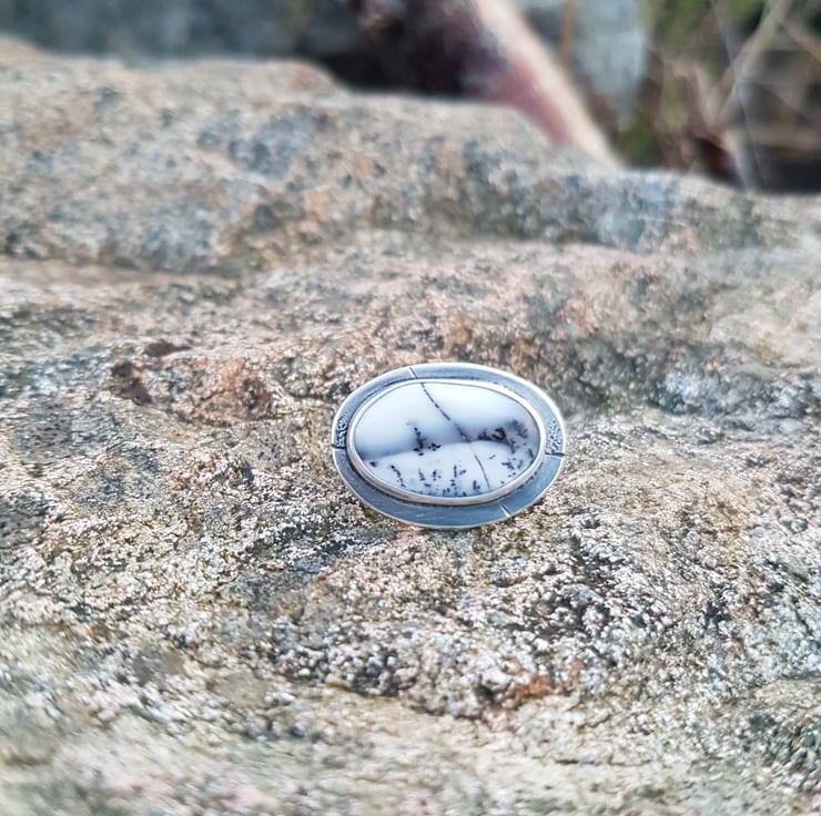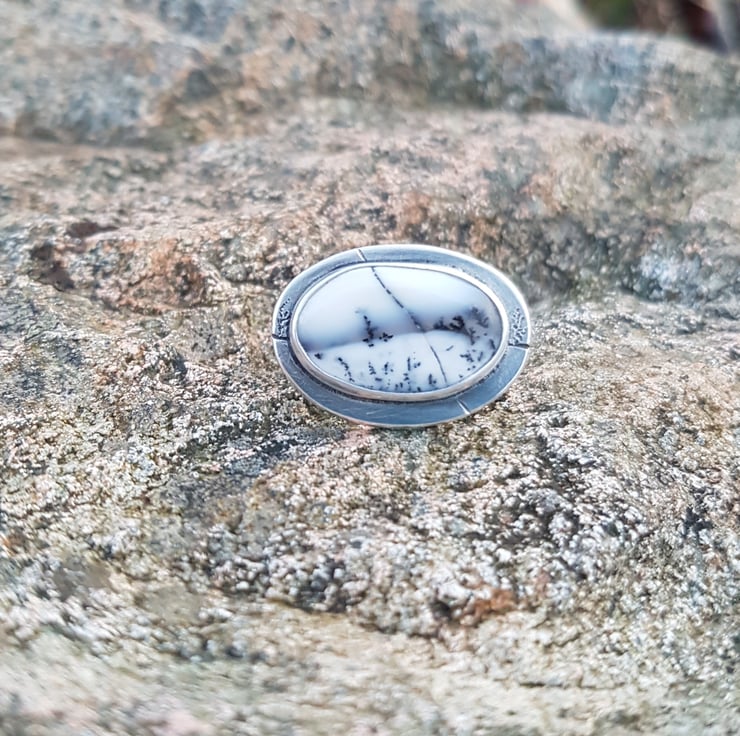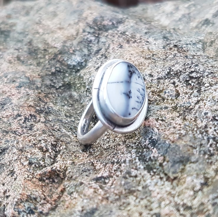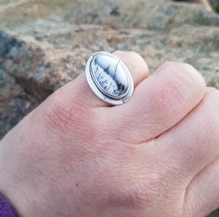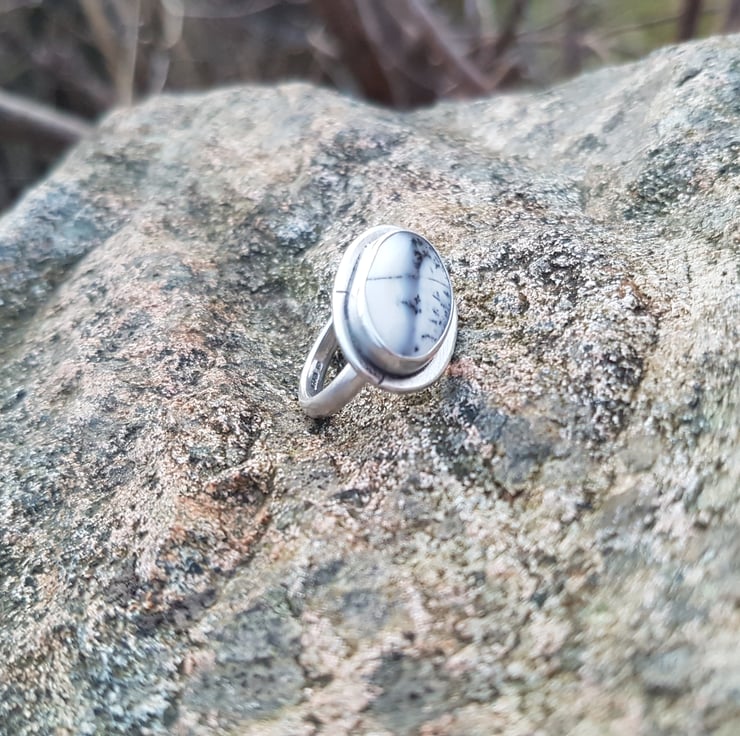 This beautiful ring is a wonderful denditic opal like a snowy winter landscape, set in fine and sterling silver.