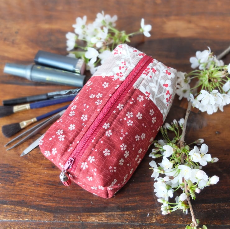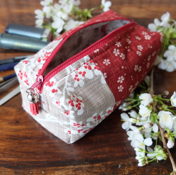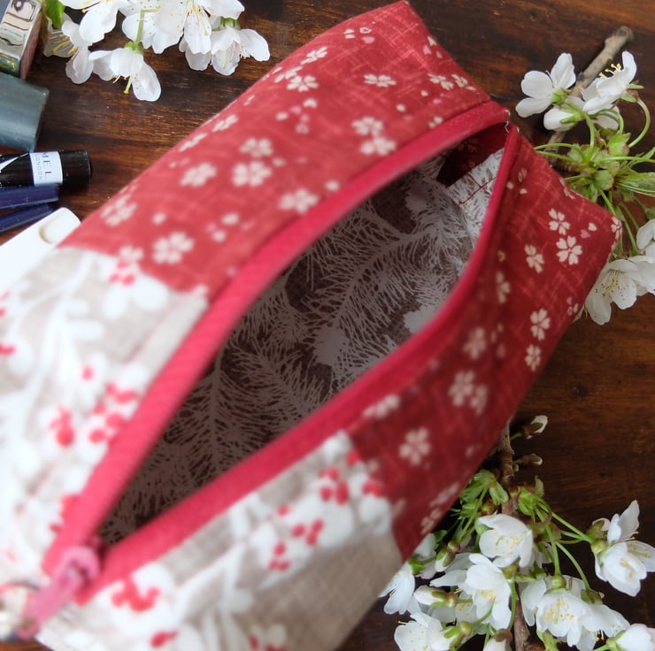 Boxy cosmetic bag made from a unique combination of Japanese sakura - cherry blossom patterned fabric teamed with a c-ordinating taupe snow blossom pattern outside and complimentary feather pattern lining. It also has a matching dark red zip and tassel zip pull.