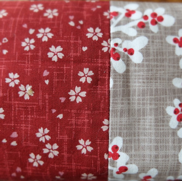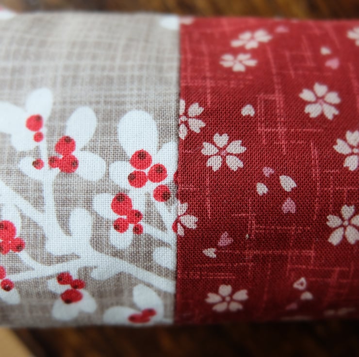 I love mixing colours and patterns to make unique one-off combinations. I've used one of my favourite Japanese patterns for this one - sakura, or cherry blossom print in a lovely wine red colour teamed with a complimentary design, inside and out.
