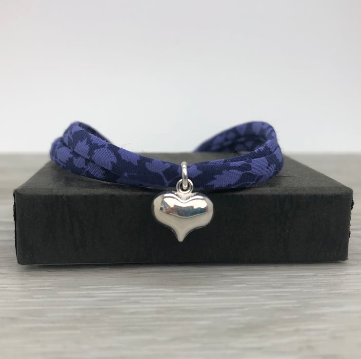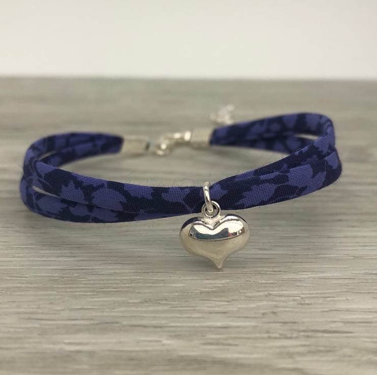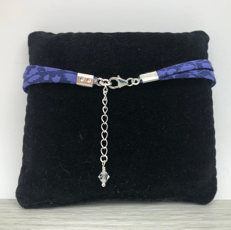 This pretty and lightweight bracelet has been made using two strands of 4mm Liberty of London ribbon. This is secured using sterling silver pinch closures and fastens with a sterling silver lobster clasp.