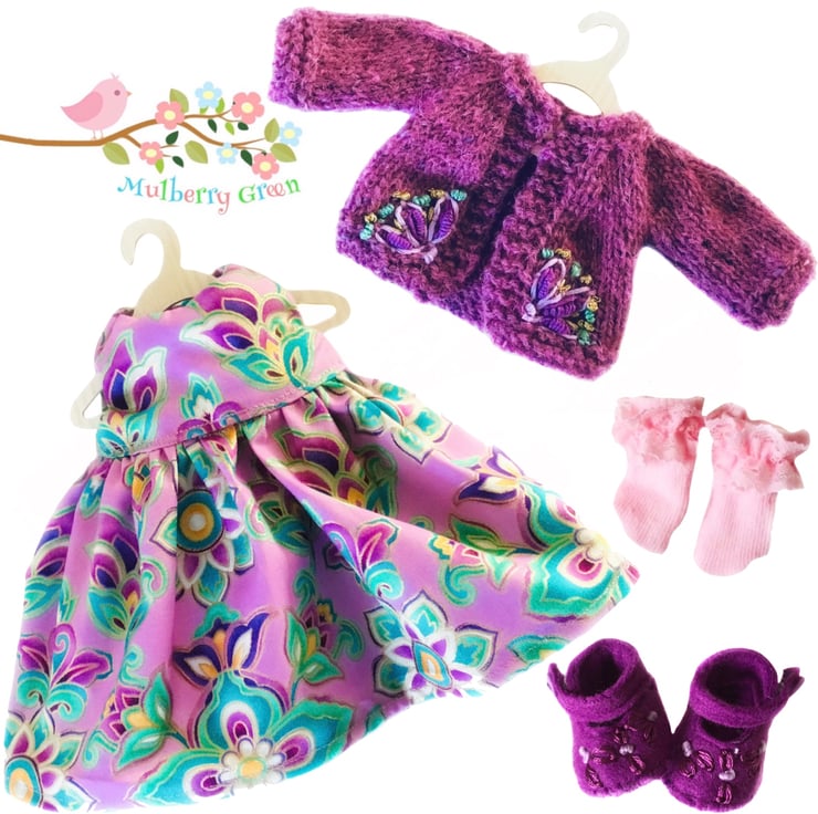 A beautiful little hand embroidered cardigan to fit the Mulberry Green characters. The cardigan is hand knitted in gorgeous peony Rowan Felted Tweed wool and comes on a little wooden hanger. It matches the Peony Paisley dress.