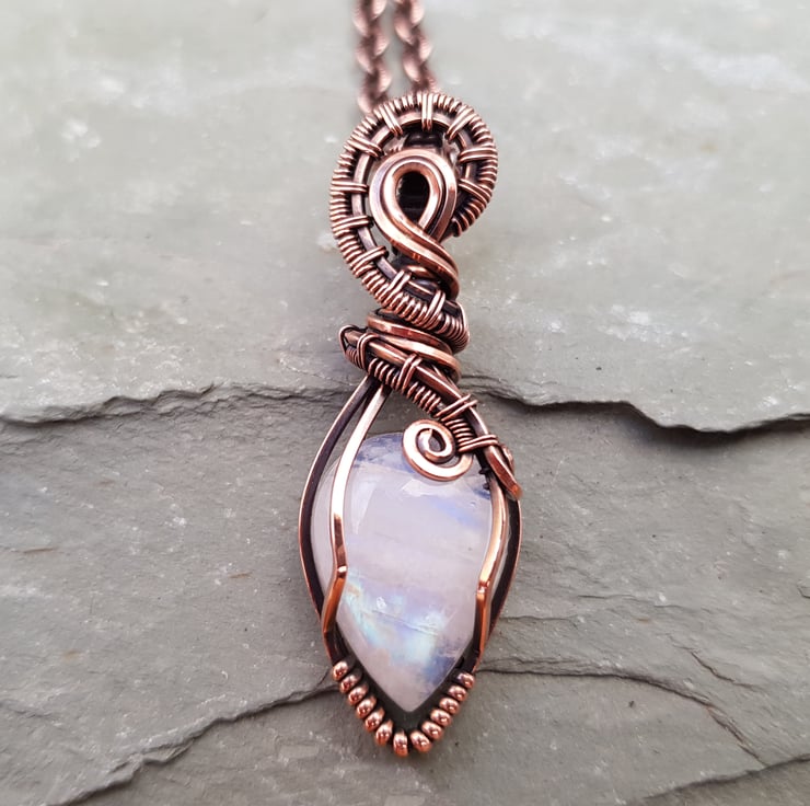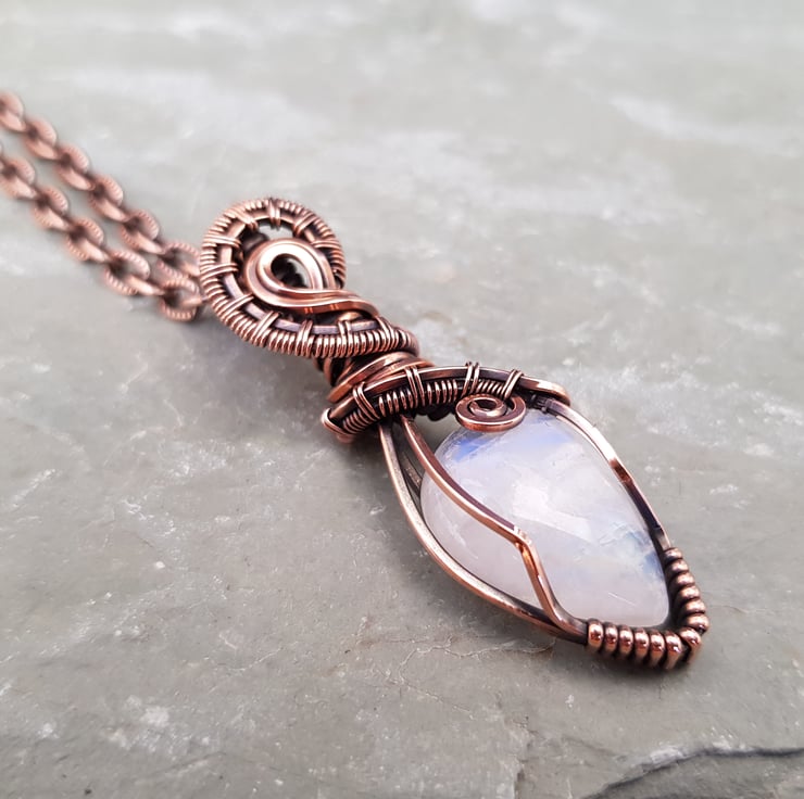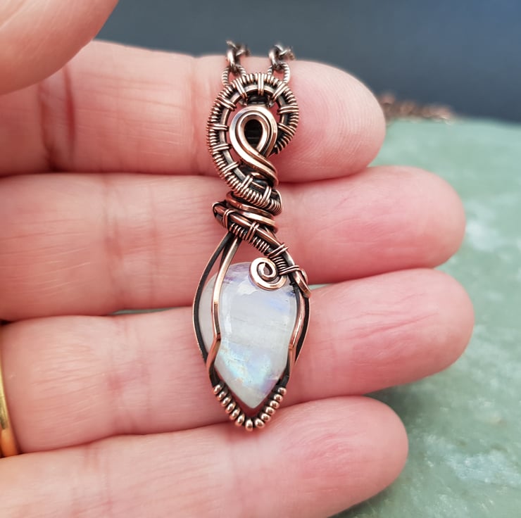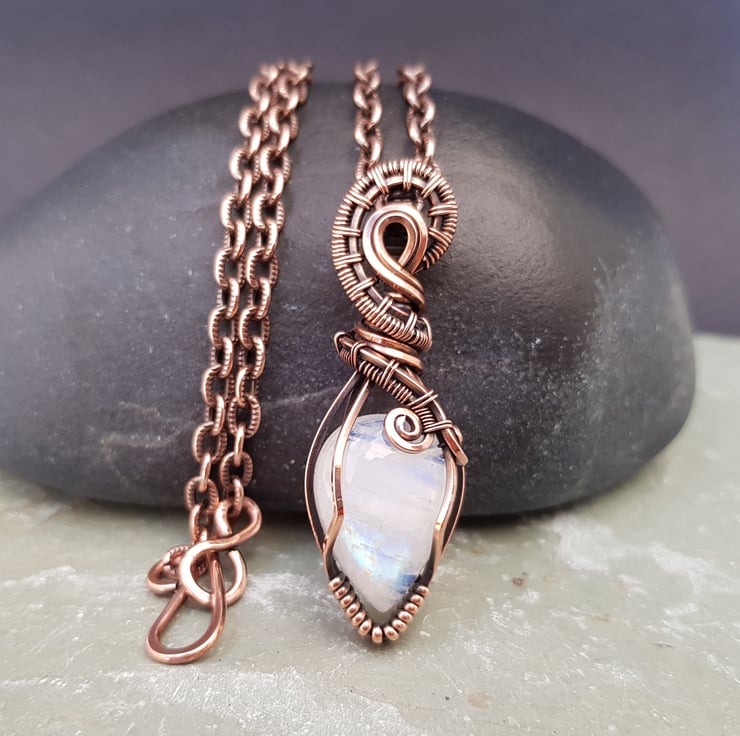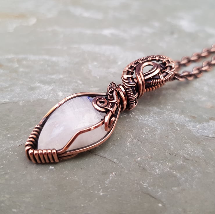 This dainty moonstone necklace is made using solid copper wire I have wire wrapped and hand woven around this pretty moonstone.
