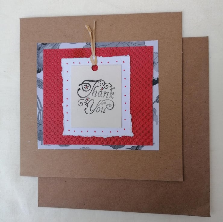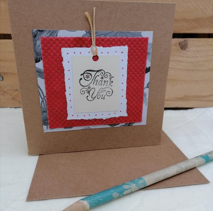 A one of a kind handmade card on recycled card stock. The card is individually hand stamped onto Kraft paper and mounted on a red textured paper and botanical wallpaper sample.