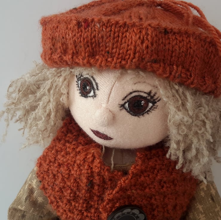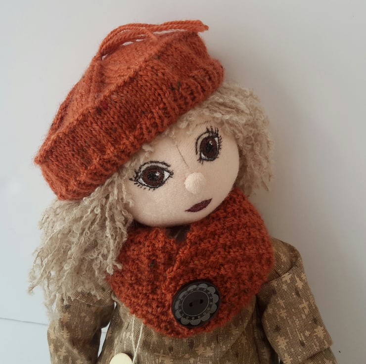 A hand knitted beret and matching shoulder wrap in a gorgeous pumpkin orange complete her outfit.All clothes are removable so in the warmer months she can discard her winter woolies.