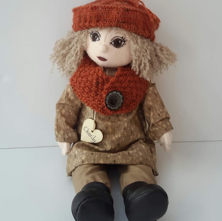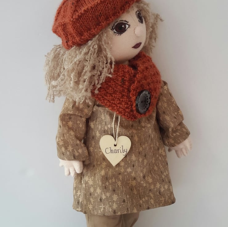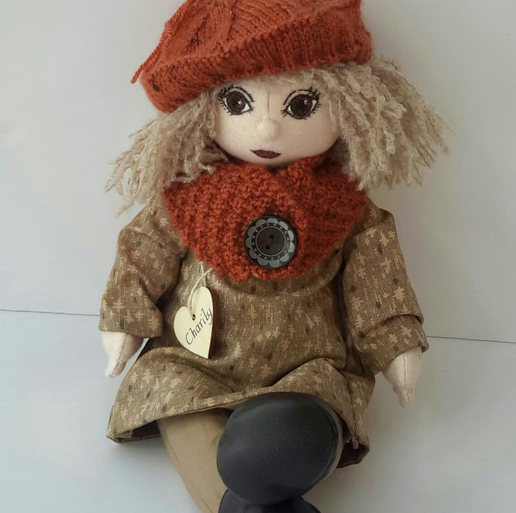 Charity is a one of a kind doll, a modern girl about town, she's approx 16" tall, 40cm and has been lovingly hand crafted from quality doll velour fabric in doll face pink.