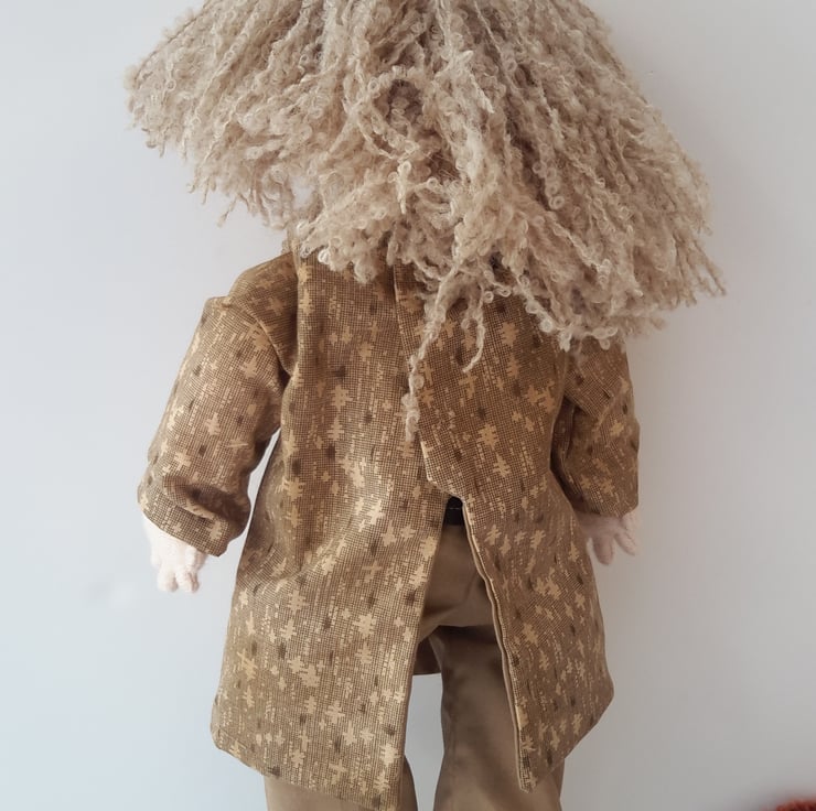 Her hair took many hours and has been made from alpaca boucle wool in beige. A coiled wig cap made from dk yarn was hand sewn to her scalp then each strand of her very thick hair was individually attached.