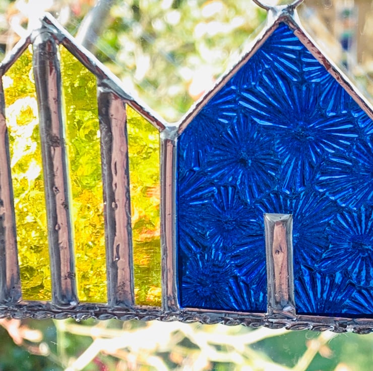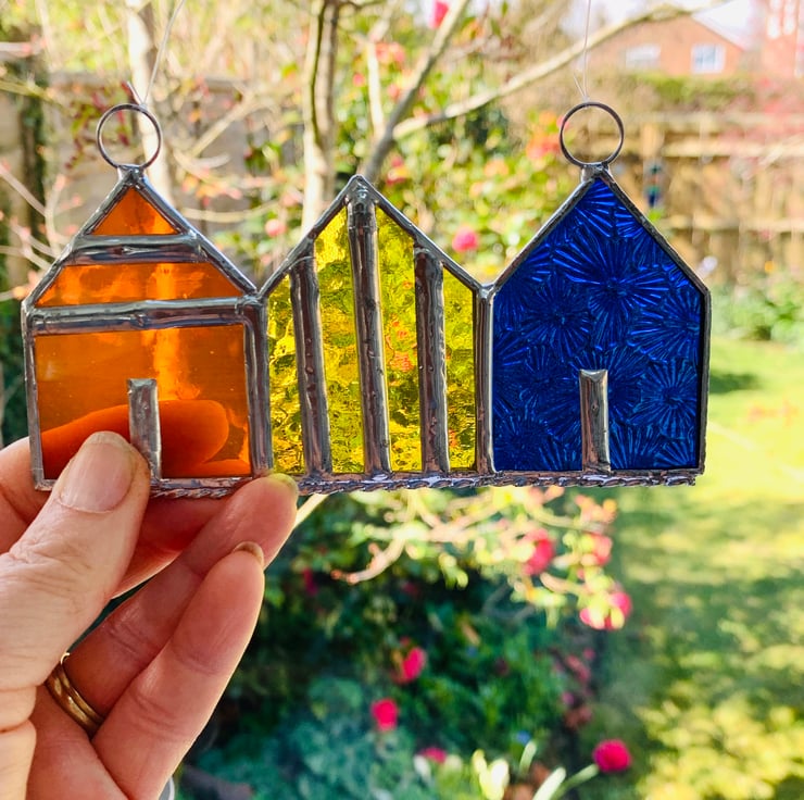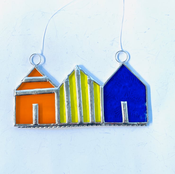 This strip of beach huts has been made from 3 huts which have been made from orange sea glass, yellow corella glass and blue florentine stained glass.