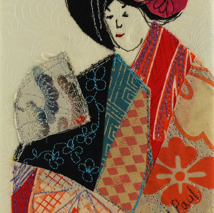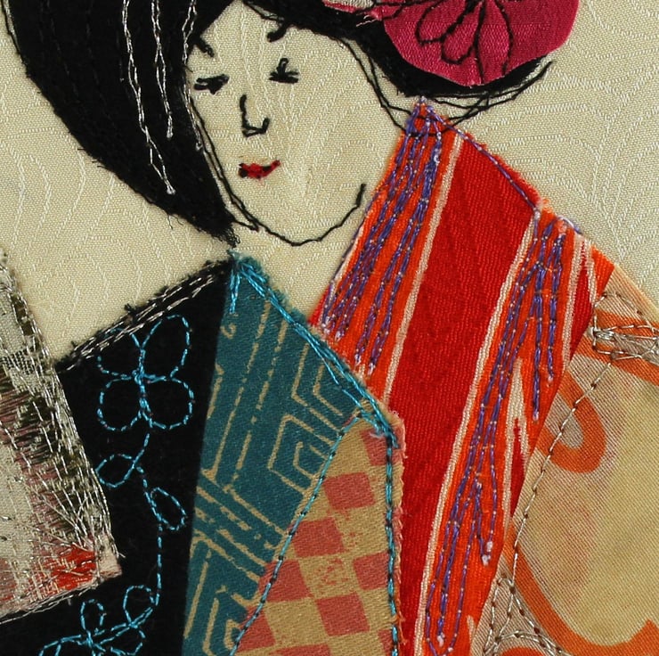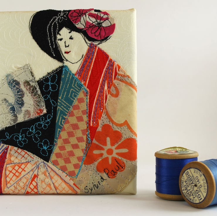I have visited Japan five times and have a collection of vintage kimonos and fabrics, mostly silk to create my textile art. I am inspired by the art and culture of Japan and the attention to detail. The fabric is beautiful with wonderful colours and designs.