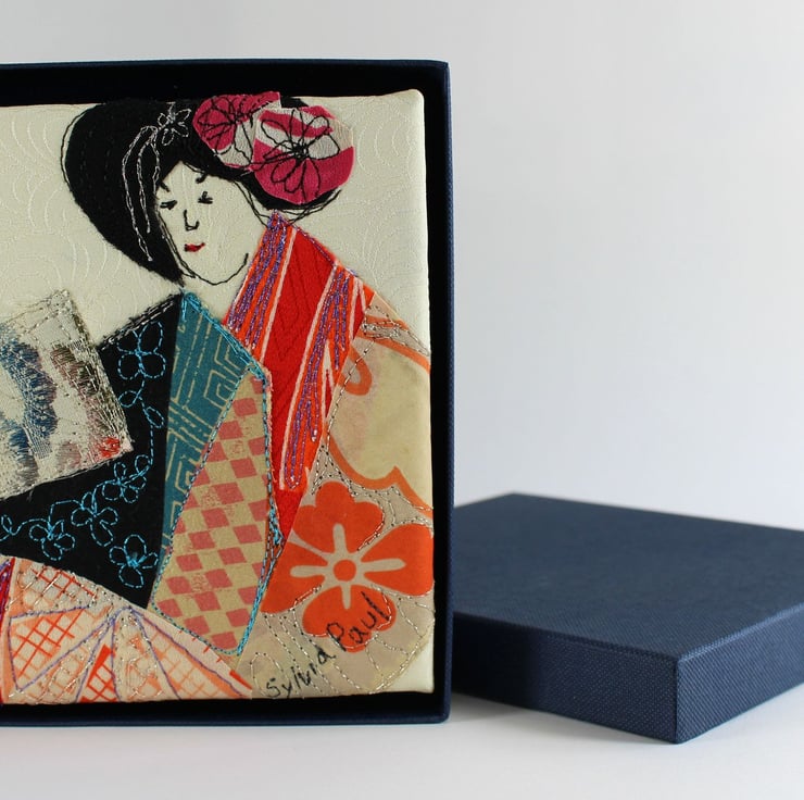 Meet Yoko. This geisha picture is made from Japanese kimono silk remnants. The technique is applique with free motion machine embroidery. I stretched the piece over a wooden frame like a canvas and the reverse is hand finished and lined. It has a hanging loop. It comes in a navy blue presentation box. It can be displayed in the box, on a shelf, or hung on the wall. It can be framed if desired. It measures 13 x 15 cm. It is an original design.